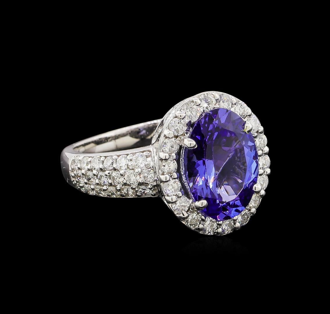One electronically tested 14KT white gold lady's cast fashion ring with a halo with a bright polish finish. The featured lady's ring has a shank measuring 2.31 millimeters wide. Identified with markings of 'K14'. Condition is new, good workmanship. Containing: One prong set oval modified brilliant cut natural tanzanite, measuring 11.43 x 8.06 x 4.90mm, (depth est.) approximate weight of 3.16ct., clarity is eye clean, medium dark, moderately strong, violetish blue color, (GIA vB 6/4), cut is very good. Transmitting light with no distortion, transparent. Colored gemstones are presumed to have been subjected to commonly used enhancement processes. Graded in the setting. Eighteen prong set round brilliant cut diamonds, measuring 1.90 - 1.85 x 1.17mm (depth est.) approximate total weight of 18 Stones = 0.46ct. Graded in the setting. Clarity SI-1 to I-1. Color: G - I Cut Good Thirty-Six prong set round brilliant cut diamonds, measuring 1.60 - 1.50 x 0.96mm (depth est.) approximate total weight of 36 Stones = 0.52ct. Graded in the setting. Clarity SI-1 to I-1. Color: G - H Cut Good Twelve prong set round brilliant cut diamonds, measuring 1.30 - 1.25 x 0.79mm (depth est.) approximate total weight of 12 Stones = 0.10 ct. Graded in the setting. Clarity SI-1 to I-1. Color: H - I Cut Good. Total Weight of Colored Stones 3.16ct.. Total Weight of Diamonds 1.08ct.. Total Weight of Ring 5.90gm.