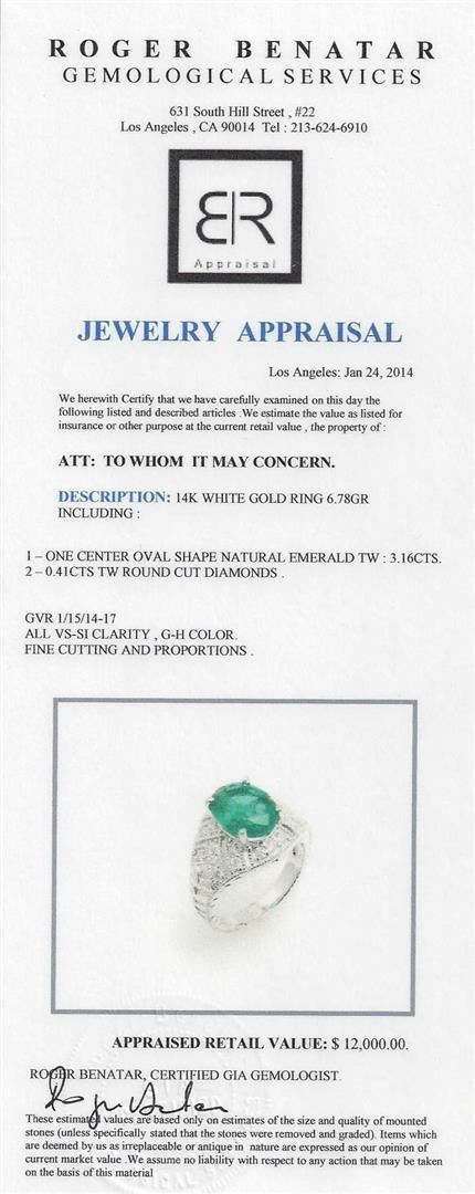 One 14KT White Gold ring 6.78GR Including: one center oval shape natural emerald tw: 3.16CTS. 0.41CTS TW round cut diamonds. All VS-SI Clarity, G-H Color Fine Cutting and Proportions. RBGS Appraised at $12,000.00.