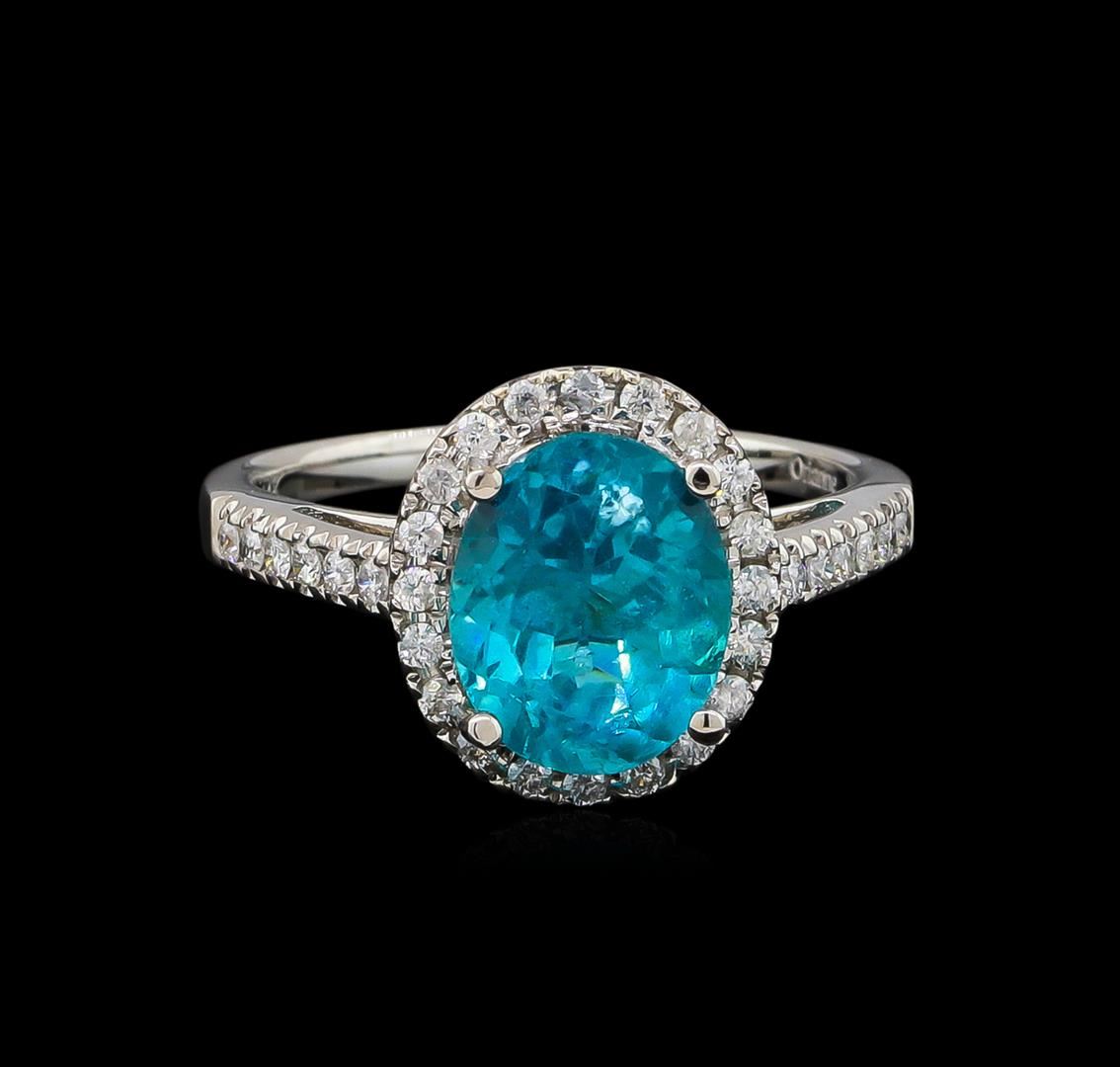One electronically tested 14KT white gold lady's cast fashion ring with a cathedral shank with a halo with a bright polish finish. The featured ladies ring has a shank measuring 1.72 millimeters in width. Trademark is Orianne. Identified with markings of "14K". Condition is new, good workmanship. Containing: One prong set oval modified brilliant cut natural apatite, measuring 9.95 x 8.06 x 5.80mm, approximate weight of 3.17ct., clarity is moderately included, medium dark, strong, bluish green color, (GIA bG 6/5), cut is good. Transmitting light somewhat diffusely, transparent to translucent. Colored gemstones are presumed to have been subjected to commonly used enhancement processes. Graded in the setting. Twelve prong set round brilliant cut diamonds, measuring 1.50 - 1.45 x 0.89mm (depth est.) approximate total weight of 12 Stones = 0.15ct. Graded in the setting. Clarity: SI-2 to I-1. Color: G - Good Twenty prong set round brilliant cut diamonds, measuring 1.30 - 1.25 x 0.77mm (depth est.) approximate total weight of 20 Stones = 0.17ct. Graded in the setting. Clarity: I-1. Color: G - Good. Total Weight of Colored Stones 3.17ct. Total Weight of Diamonds 0.32ct. Total Weight of Ring 3.40gm. GAS Appraised at $3,370.00.
