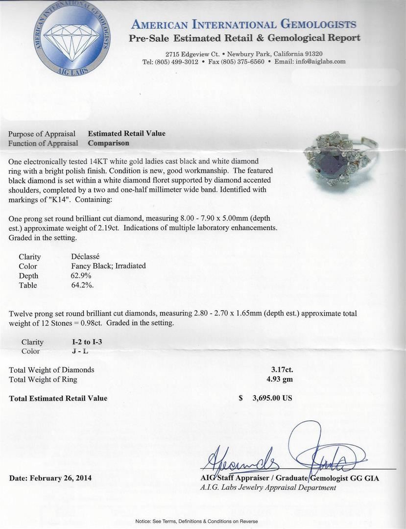 One electronically tested 14KT white gold ladies cast black and white diamond ring with a bright polish finish. The featured black diamond is set within a white diamond floret supported by diamond accented shoulders, completed by a two and one-half millimeter wide band. Identified with markings of "K14". Condition is new, good workmanship. Containing: One prong set round brilliant cut diamond, measuring 8.00 - 7.90 x 5.00mm (depth est.) approximate weight of 2.19ct. Indications of multiple laboratory enhancements. Graded in the setting. Clarity Déclassé‚. Color: Fancy Black; Irradiated. Depth: 62.9%. Table: 64.2%. Twelve prong set round brilliant cut diamonds, measuring 2.80 - 2.70 x 1.65mm (depth est.) approximate total weight of 12 Stones = 0.98ct. Graded in the setting. Clarity: I-2 to I-3. Color: J - L. Total Weight of Diamonds 3.17ct. AIG Appraised at $3,695.00.