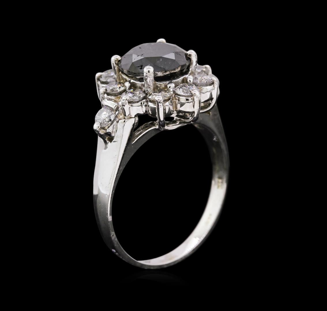 One electronically tested 14KT white gold ladies cast black and white diamond ring with a bright polish finish. The featured black diamond is set within a white diamond floret supported by diamond accented shoulders, completed by a two and one-half millimeter wide band. Identified with markings of "K14". Condition is new, good workmanship. Containing: One prong set round brilliant cut diamond, measuring 8.00 - 7.90 x 5.00mm (depth est.) approximate weight of 2.19ct. Indications of multiple laboratory enhancements. Graded in the setting. Clarity Déclassé‚. Color: Fancy Black; Irradiated. Depth: 62.9%. Table: 64.2%. Twelve prong set round brilliant cut diamonds, measuring 2.80 - 2.70 x 1.65mm (depth est.) approximate total weight of 12 Stones = 0.98ct. Graded in the setting. Clarity: I-2 to I-3. Color: J - L. Total Weight of Diamonds 3.17ct. AIG Appraised at $3,695.00.