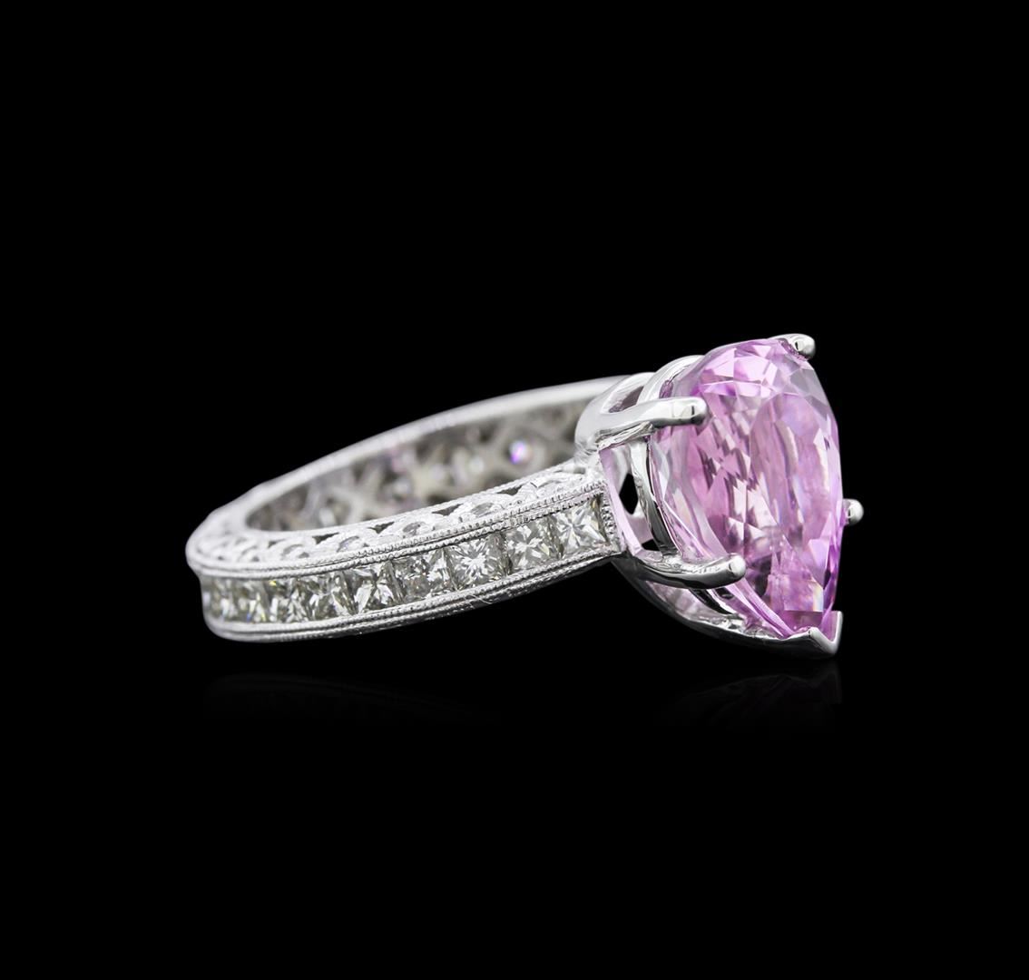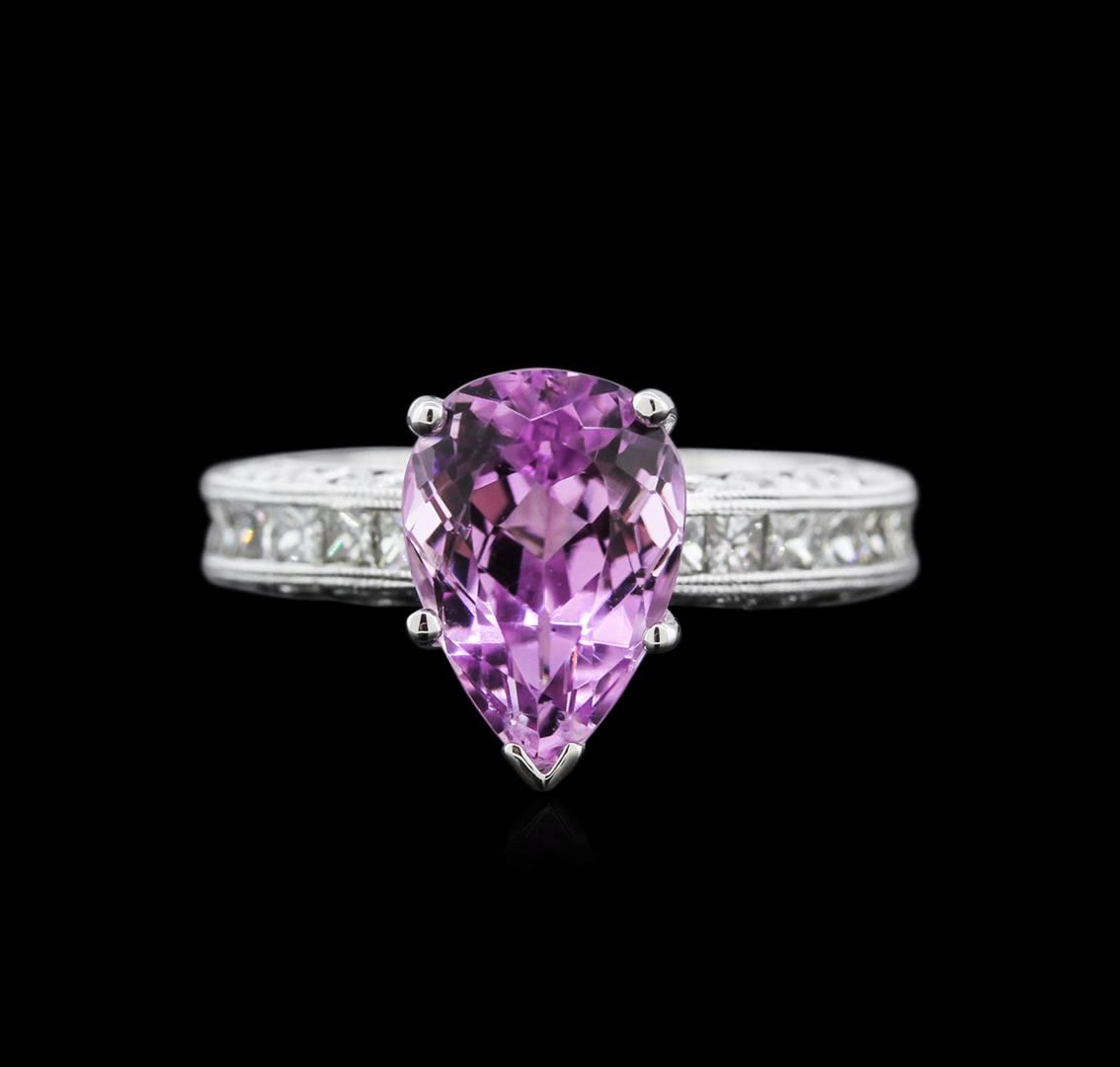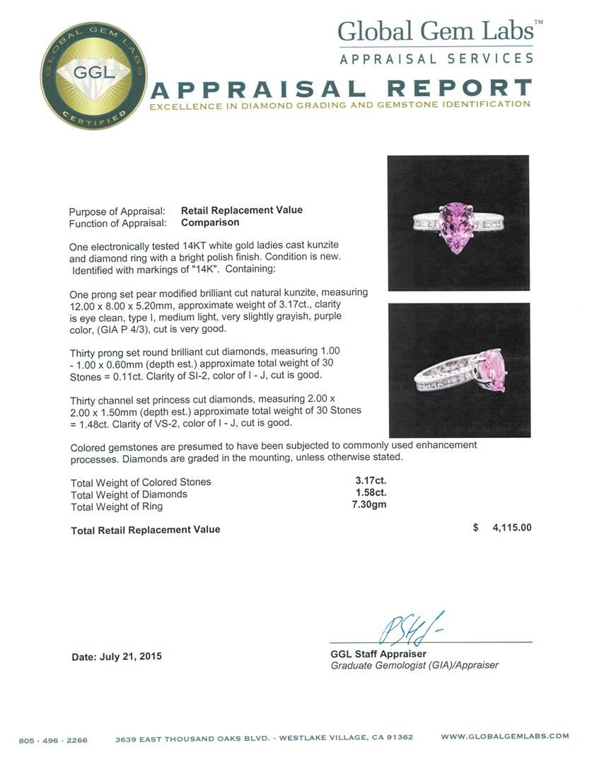 One electronically tested 14KT white gold ladies cast kunzite and diamond ring with a bright polish finish. Identified with markings of "14K". Condition is new. Containing: One prong set pear modified brilliant cut natural kunzite, measuring 12.00 x 8.00 x 5.20mm, approximate weight of 3.17ct., clarity is eye clean, type I, medium light, very slightly grayish, purple color, (GIA P 4/3), cut is very good. Thirty prong set round brilliant cut diamonds, measuring 1.00 - 1.00 x 0.60mm (depth est.) approximate total weight of 30 Stones = 0.11ct. Clarity: SI-2. Color: I - J, Cut is Good. Thirty channel set princess cut diamonds, measuring 2.00 x 2.00 x 1.50mm (depth est.) approximate total weight of 30 Stones = 1.48ct. Clarity: VS-2. Color: I - J, Cut is Good. Colored gemstones are presumed to have been subjected to commonly used enhancement processes. Diamonds are graded in the mounting, unless otherwise stated. Total Weight of Colored Stones 3.17ct. Total Weight of Diamonds 1.58ct. Total Weight of Ring 7.30gm. GGL Appraised at $4,115.00.