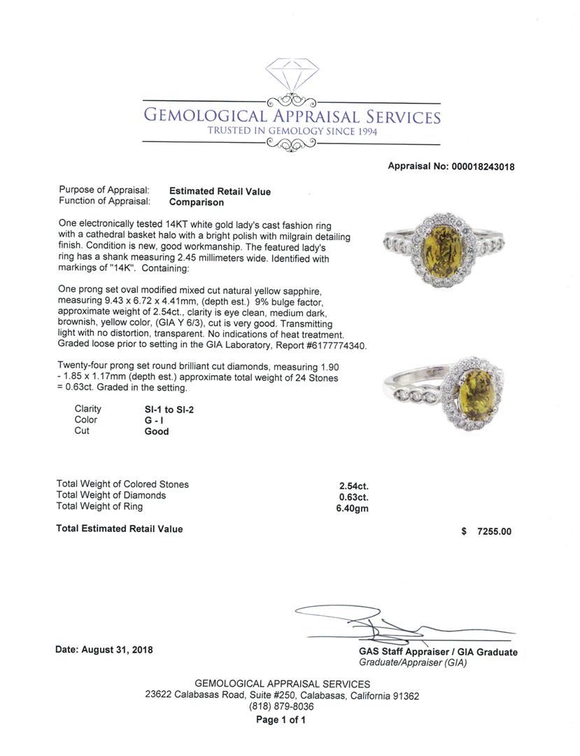 One electronically tested 14KT white gold lady's cast fashion ring with a cathedral basket halo with a bright polish with milgrain detailing finish. The featured lady's ring has a shank measuring 2.45 millimeters wide. Identified with markings of '14K'. Condition is new, good workmanship. Containing: One prong set oval modified mixed cut natural yellow sapphire, measuring 9.43 x 6.72 x 4.41mm, (depth est.) 9%. bulge factor, approximate weight of 2.54ct., clarity is eye clean, medium dark, brownish, yellow color, (GIA Y 6/3), cut is very good. Transmitting light with no distortion, transparent. No indications of heat treatment. Graded loose prior to setting in the GIA Laboratory, Report #6177774340. Twenty-Four prong set round brilliant cut diamonds, measuring 1.90 - 1.85 x 1.17mm (depth est.) approximate total weight of 24 Stones = 0.63ct. Graded in the setting. Color G - I Clarity SI-1 to SI-2 Cut Good. Total Weight of Colored Stones 2.54ct.. Total Weight of Diamonds 0.63ct.. Total Weight of Ring 6.40gm GAS Appraised at $7255.00. GAS Appraised.
