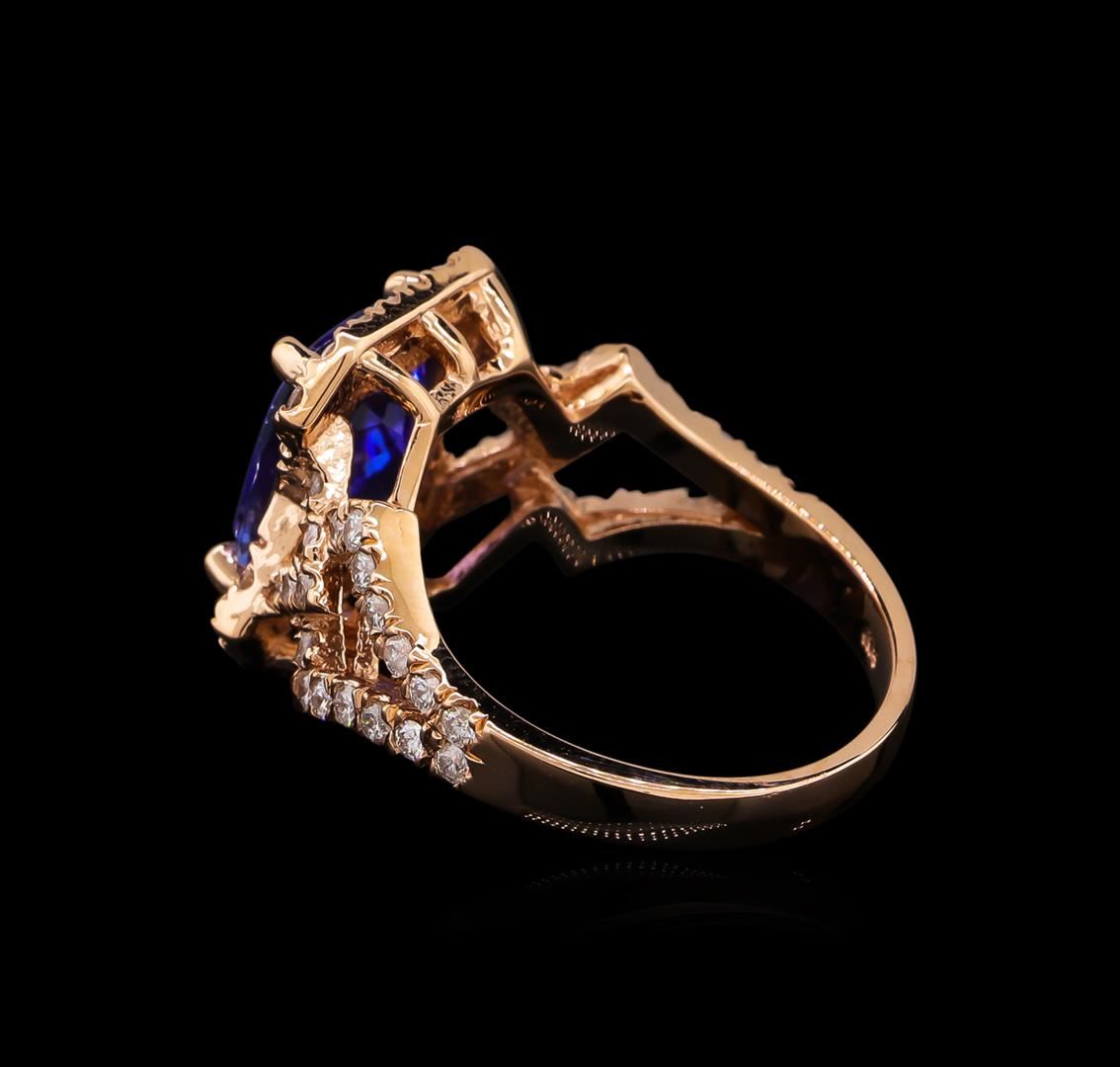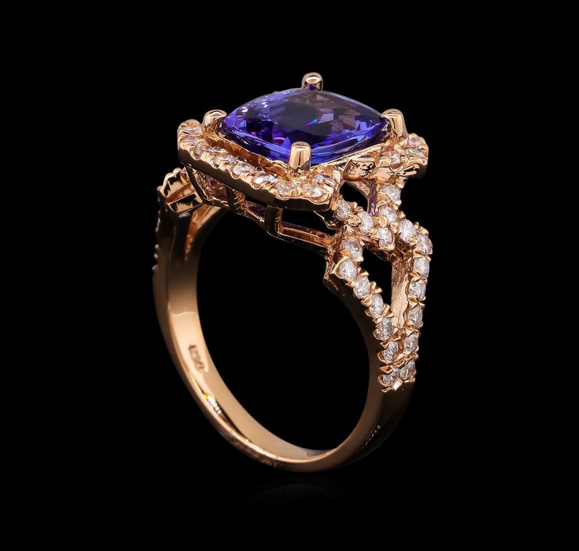One electronically tested 14KT rose gold lady's cast fashion ring with a split shank with a bright polish finish. The featured lady's ring has a shank measuring 2.45 millimeters wide. Identified with markings of "K14". Condition is new, good workmanship. Containing: One prong set rectangular cushion modified brilliant cut natural tanzanite, measuring 9.98 x 7.94 x 5.01mm, approximate weight of 3.17ct., clarity is eye clean, type I, medium light, moderately strong, bluish violet color, (GIA bV 4/4), cut is very good. Transmitting light with no distortion, transparent. Colored gemstones are presumed to have been subjected to commonly used enhancement processes. Graded in the setting. Fifty-Eight prong set round brilliant cut diamonds, measuring 1.50 - 1.40 x 0.90mm (depth est.) approximate total weight of 58 Stones = 0.68ct. Graded in the setting. Clarity: SI-1 to I-1. Color: H - I. Cut Good. Total Weight of Colored Stones 3.17ct. Total Weight of Diamonds 0.68ct. Total Weight of Ring 5.70gm. GAS Appraised at $6,860.00.
