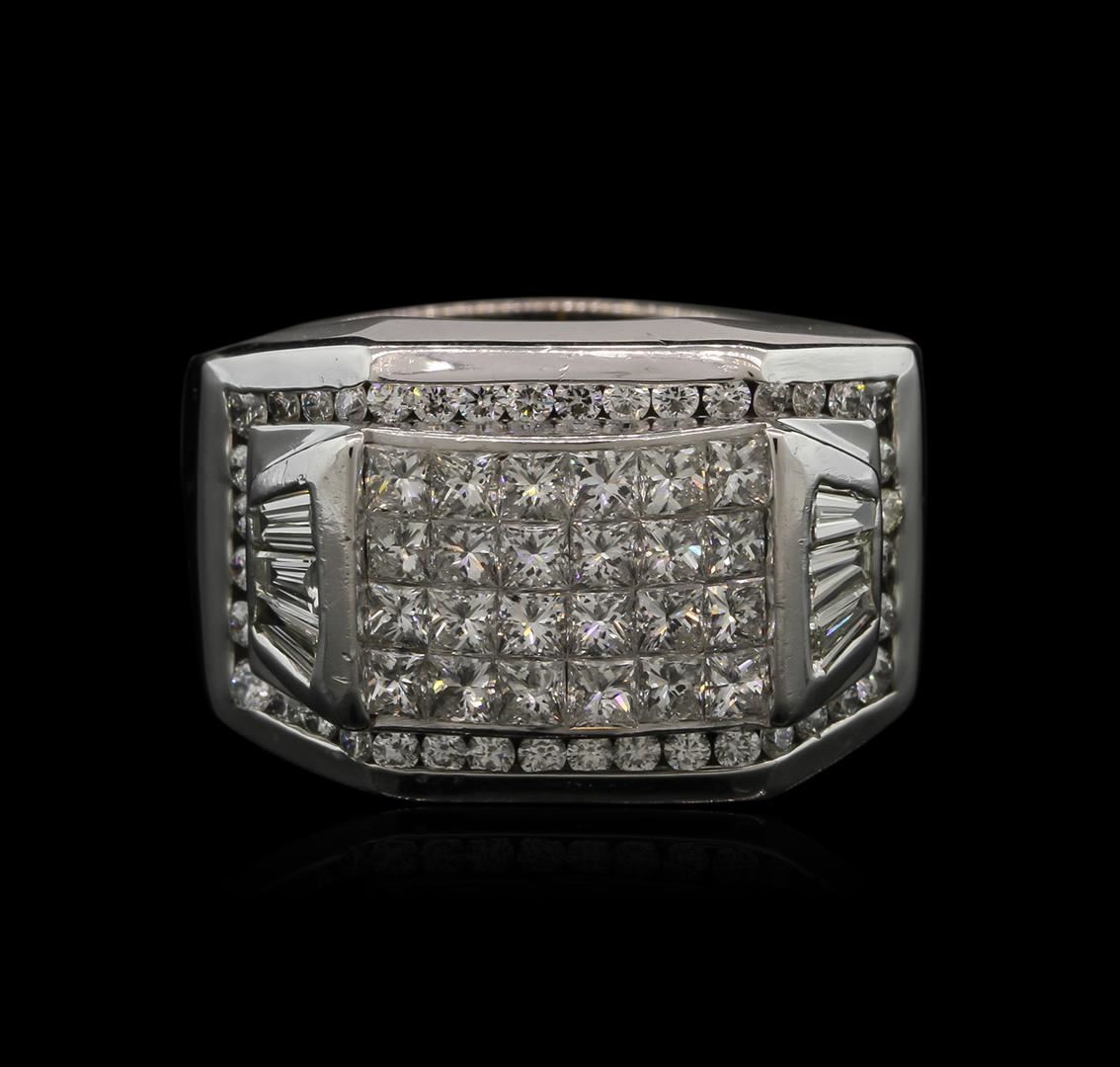 One electronically tested 14KT white gold mens cast diamond ring with a bright polish finish. Identified with markings of "14K". Condition is new. Containing: Forty channel set round brilliant cut diamonds, measuring 1.90 - 1.40 x 0.99mm (depth est.) appr GGL Appraised at $8,620.00.