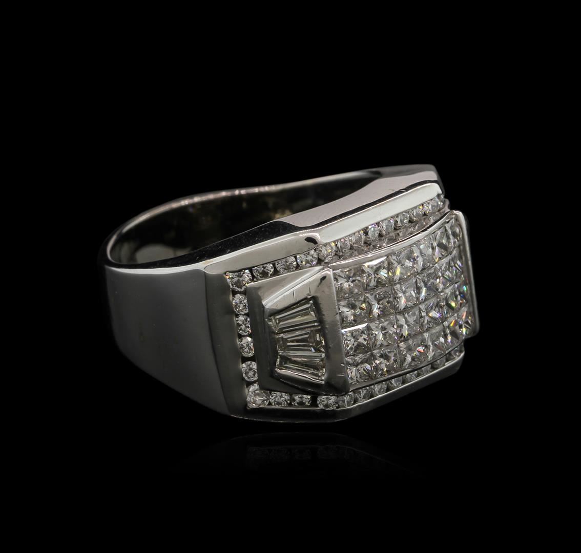 One electronically tested 14KT white gold mens cast diamond ring with a bright polish finish. Identified with markings of "14K". Condition is new. Containing: Forty channel set round brilliant cut diamonds, measuring 1.90 - 1.40 x 0.99mm (depth est.) approximate total weight of 40 Stones = 0.66ct. Clarity: SI-1. Color: H - I, Cut is Good. Twenty-Four invisible set princess cut diamonds, measuring 2.40 x 2.40 x 1.80mm (depth est.) approximate total weight of 24 Stones = 2.04ct. Clarity: VS-2 to SI-1. Color: H - I, Cut is Very Good. Six channel set baguette cut diamonds, measuring 3.50 x 1.70 x 1.45mm (depth est.) approximate total weight of 6 Stones = 0.47ct. Clarity: VS-2. Color: I - J, Cut is Good. Diamonds are graded in the mounting, unless otherwise stated. Total Weight of Diamonds 3.17ct. Total Weight of Ring 25.50 grams. GGL Appraised at $8,620.00.