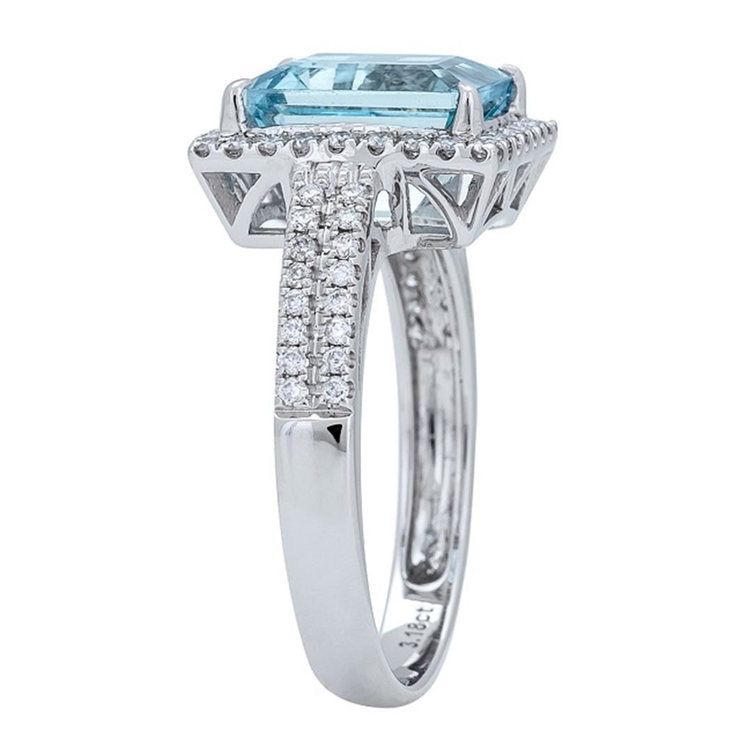 One Aquamarine and Diamond Ring featuring: 14KT White Gold with a total weight of 3.35 grams, Aquamarine with a total weight of 3.18ct, and 62 Round Cut Diamonds with a total weight of 0.38ctw.