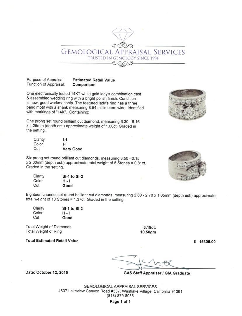One electronically tested 14KT white gold lady's combination cast & assembled wedding ring with a bright polish finish. The featured lady's ring has a three band motif with a shank measuring 8.54 millimeters wide. Identified with markings of "14K". Condition is new, good workmanship. Containing: One prong set round brilliant cut diamond, measuring 6.30 - 6.16 x 4.25mm (depth est.) approximate weight of 1.00ct. Graded in the setting. Clarity: I-1. Color: Very Good Six prong set round brilliant cut diamonds, measuring 3.50 - 3.15 x 2.00mm (depth est.) approximate total weight of 6 Stones = 0.81ct. Graded in the setting. Clarity: SI-1 to SI-2. Color: H - I. Cut Good Eighteen channel set round brilliant cut diamonds, measuring 2.80 - 2.70 x 1.65mm (depth est.) approximate total weight of 18 Stones = 1.37ct. Graded in the setting. Clarity: SI-1 to SI-2. Color: H - I. Cut Good. Total Weight of Diamonds 3.18ct. Total Weight of Ring 10.50gm. GAS Appraised at $15,305.00.