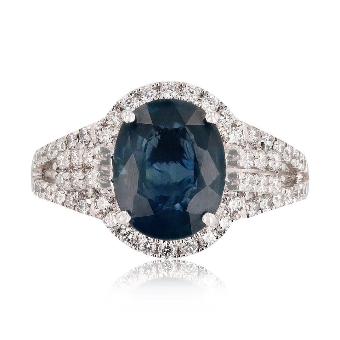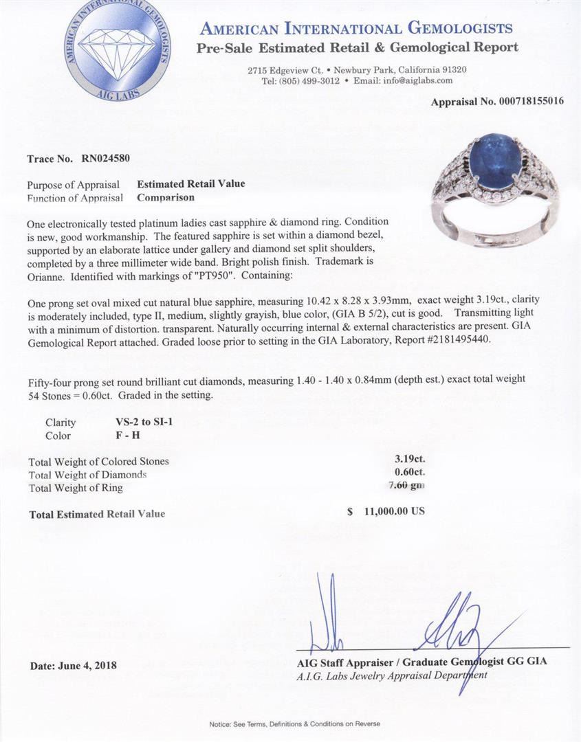3.19ct Blue Sapphire and 0.60ctw Diamond Platinum Ring (GIA CERTIFIED). One electronically tested platinum ladies cast sapphire and diamond ring. Condition is new, good workmanship. The featured sapphire is set within a diamond bezel, supported by an elaborate lattice under gallery and diamond set split shoulders, completed by a three millimeter wide band. Bright polish finish. Trademark is Orianne. Identified with markings of "PT950". Containing: One prong set oval mixed cut natural blue sapphire, measuring 10.42 x 8.28 x 3.93mm, exact weight 3.19ct., clarity is moderately included, type II, medium, slightly grayish, blue color, (GIA B 5/2), cut is good. Transmitting light with a minimum of distortion. transparent. Naturally occurring internal & external characteristics are present. GIA Gemological Report attached. Graded loose prior to setting in the GIA Laboratory, Report 2181495440. Fifty-four prong set round brilliant cut diamonds, measuring 1.40 - 1.40 x 0.84mm (depth est.) exact total weight 54 Stones = 0.60ctw. Graded in the setting. Clarity VS-2 to SI-1 Color F - H Total Weight of Colored Stones 3.19ct. Total Weight of Diamonds 0.60ctw. Total Weight of Ring 7.60 gm