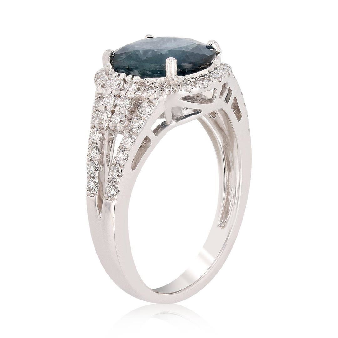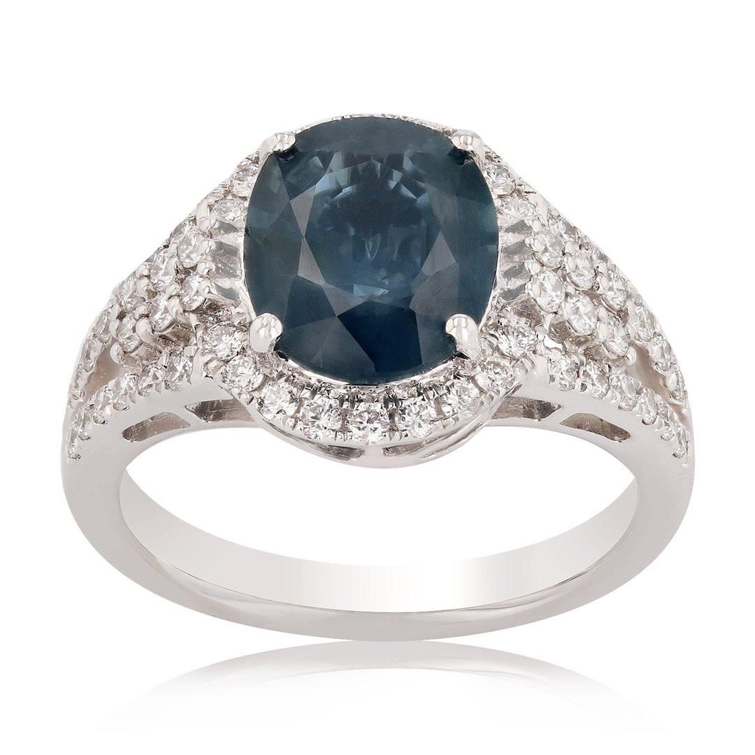 3.19ct Blue Sapphire and 0.60ctw Diamond Platinum Ring (GIA CERTIFIED). One electronically tested platinum ladies cast sapphire and diamond ring. Condition is new, good workmanship. The featured sapphire is set within a diamond bezel, supported by an elaborate lattice under gallery and diamond set split shoulders, completed by a three millimeter wide band. Bright polish finish. Trademark is Orianne. Identified with markings of "PT950". Containing: One prong set oval mixed cut natural blue sapphire, measuring 10.42 x 8.28 x 3.93mm, exact weight 3.19ct., clarity is moderately included, type II, medium, slightly grayish, blue color, (GIA B 5/2), cut is good. Transmitting light with a minimum of distortion. transparent. Naturally occurring internal & external characteristics are present. GIA Gemological Report attached. Graded loose prior to setting in the GIA Laboratory, Report 2181495440. Fifty-four prong set round brilliant cut diamonds, measuring 1.40 - 1.40 x 0.84mm (depth est.) exact total weight 54 Stones = 0.60ctw. Graded in the setting. Clarity VS-2 to SI-1 Color F - H Total Weight of Colored Stones 3.19ct. Total Weight of Diamonds 0.60ctw. Total Weight of Ring 7.60 gm