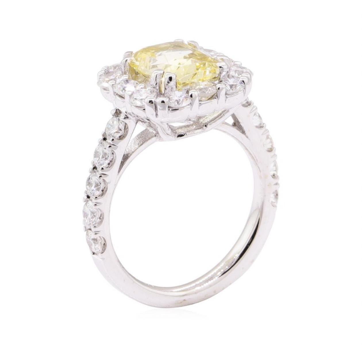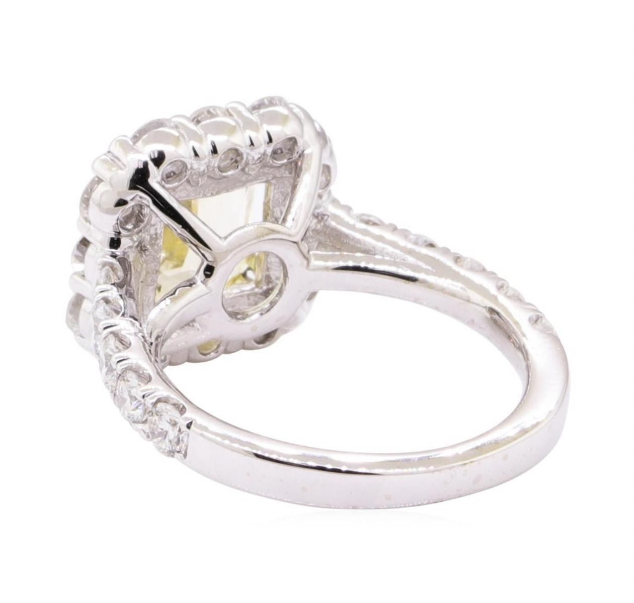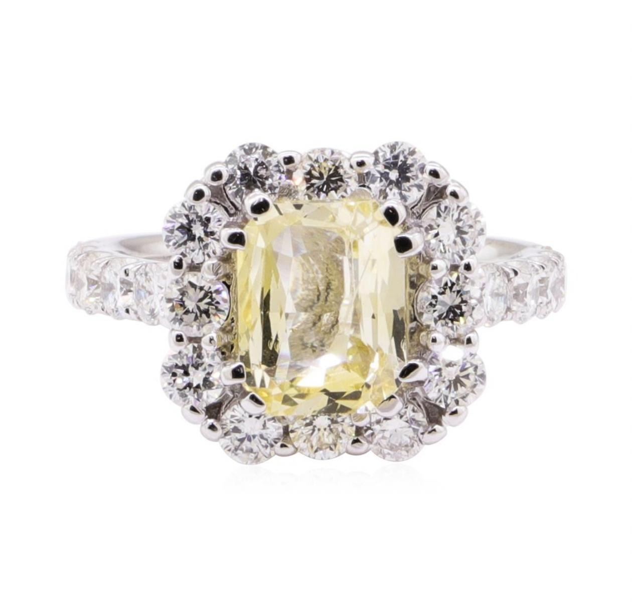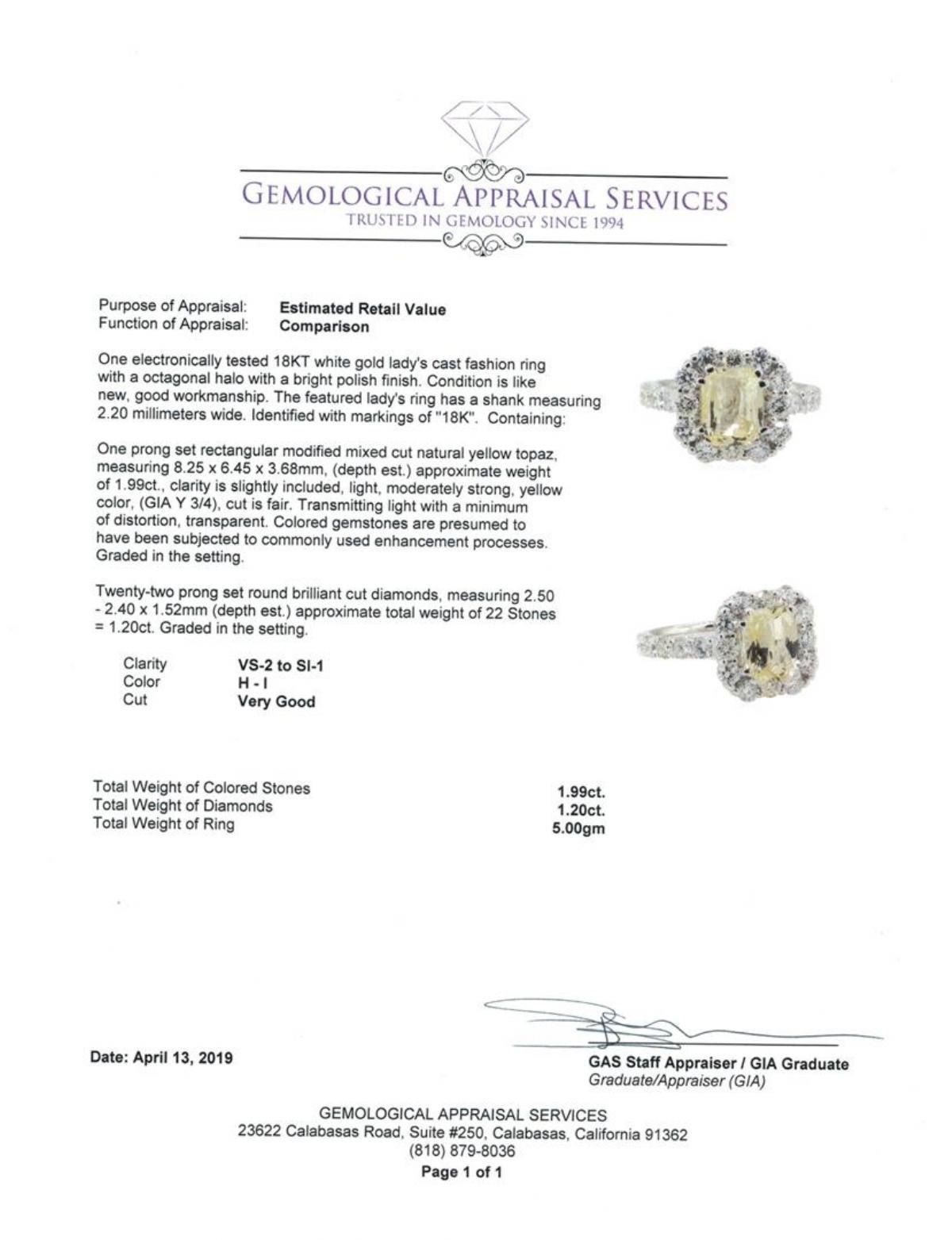 One electronically tested 18KT white gold lady's cast fashion ring with a octagonal halo with a bright polish finish. The featured lady's ring has a shank measuring 2.20 millimeters wide. Identified with markings of '18K'. Condition is like new, good workmanship. Containing: One prong set rectangular modified mixed cut natural yellow topaz, measuring 8.25 x 6.45 x 3.68mm, (depth est.) approximate weight of 1.99ct., clarity is slightly included, light, moderately strong, yellow color, (GIA Y 3/4), cut is fair. Transmitting light with a minimum of distortion, transparent. Colored gemstones are presumed to have been subjected to commonly used enhancement processes. Graded in the setting. Twenty-Two prong set round brilliant cut diamonds, measuring 2.50 - 2.40 x 1.52mm (depth est.) approximate total weight of 22 Stones = 1.20 ct. Graded in the setting. Color H - I Clarity VS-2 to SI-1 Cut Very Good. Total Weight of Colored Stones 1.99ct.. Total Weight of Diamonds 1.20 ct.. Total Weight of Ring 5.00gm GAS Appraised at $4490.00. GAS Appraised.