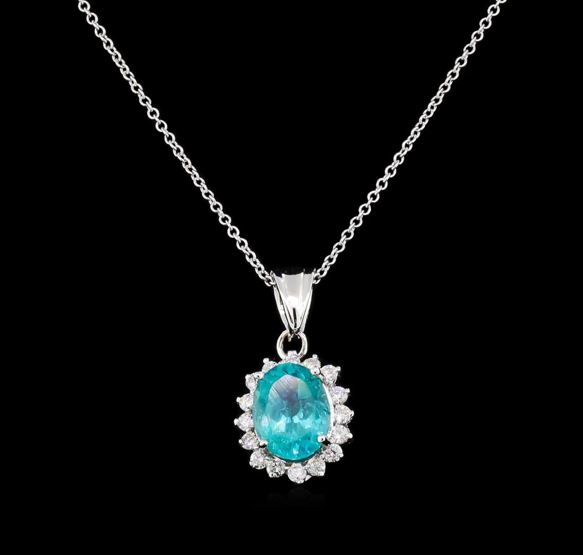 One pendant with chain featuring: 14KT white gold weighing 2.40 grams containing one apatite with a total weight of 3.20ct and diamonds with a total weight of 0.45ct.