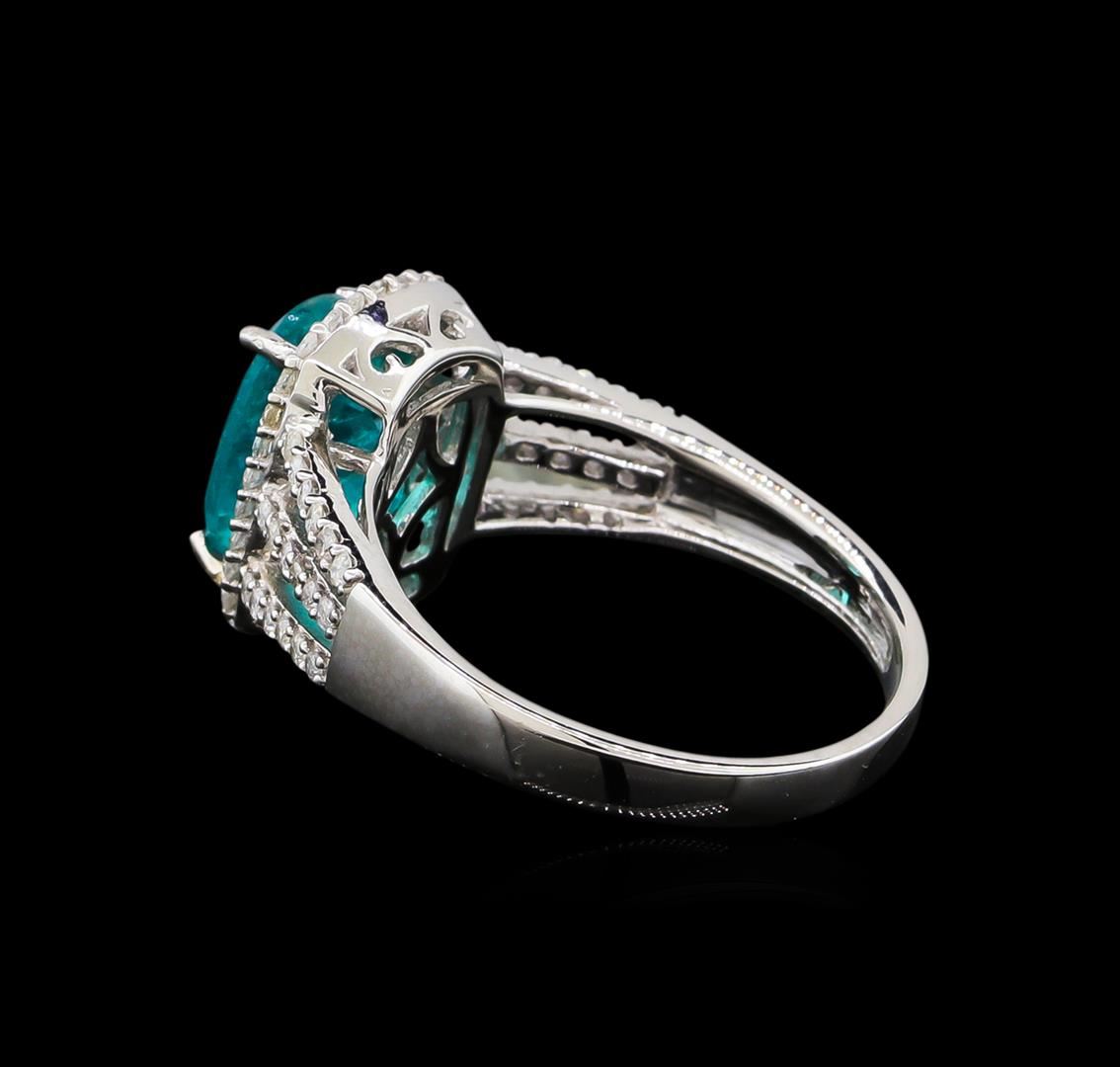 One electronically tested 14KT white gold lady's cast split shank halo ring with a bright polish finish. The featured ladies ring has a shank measuring 2.33 millimeters in width. Trademark is Orianne. Identified with markings of "14K". Condition is new, good workmanship. Containing: One prong set oval modified brilliant cut natural apatite, measuring 10.00 x 8.00 x 5.90mm, approximate weight of 3.20ct., clarity is moderately included, medium dark, moderately strong, bluish green color, (GIA bG 6/4), cut is good. Transmitting light somewhat diffusely, transparent to translucent. Colored gemstones are presumed to have been subjected to commonly used enhancement processes. Graded in the setting. Sixty-Six prong set round brilliant cut diamonds, measuring 1.20 - 1.00 x 0.69mm (depth est.) approximate total weight of 66 Stones = 0.34ct. Graded in the setting. Clarity: I-1 to I-2. Color: H - I. Cut Good. Total Weight of Colored Stones 3.20ct. Total Weight of Diamonds 0.34ct. Total Weight of Ring 4.10gm. GAS Appraised at $4,020.00.
