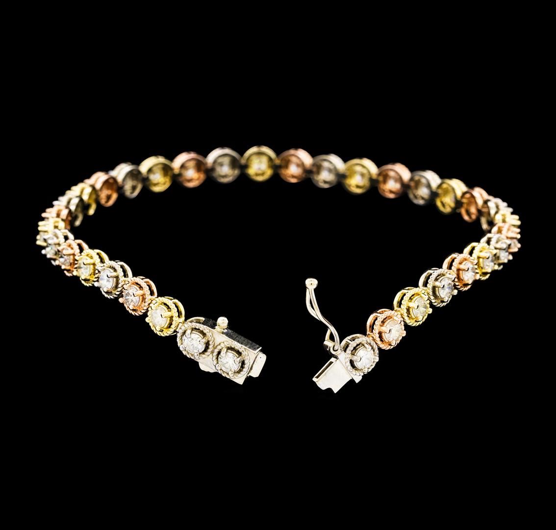 One electronically tested 14KT yellow, white, and rose gold lady's combination cast & assembled tennis bracelet with a tongue clasp with foldover safety with a bright polish with milgrain detailing finish. The featured lady's bracelet measures approximately 7.25 inches in length. Identified with markings of 'K14'. Condition is new, good workmanship. Containing: Thirty-Five prong set round brilliant cut diamonds, measuring 2.90 - 2.85 x 1.79mm (depth est.) approximate total weight of 35 Stones = 3.20ct. Graded in the setting. Clarity SI-1 to SI-2. Color: H - J Cut Good. Total Weight of Diamonds 3.20ct.. Total Weight of Bracelet 12.30gm. GAS Appraised at $8,460.00.