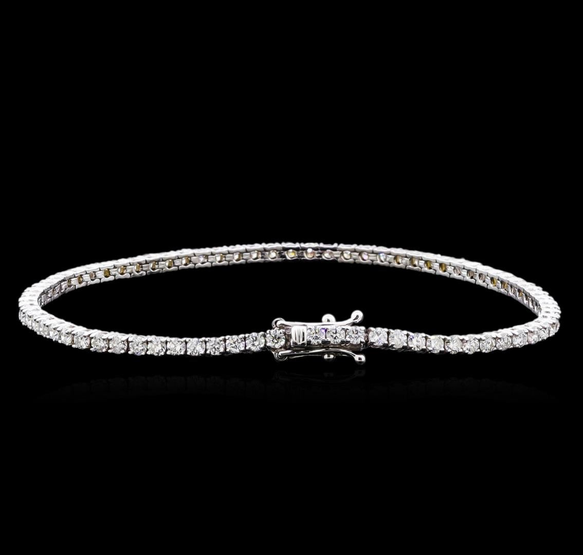 One 18KT white gold 3.20ctw diamond bracelet. Metal: 18KT solid white gold. Face Measurements: 2.5 x 180mm. Size: 7. Finish: Bright polish. Total item weight: 7.0 grams. Markings: Stamped 18K. Country Made: USA. Main Stone: Diamond. Quantity: 75. Shape: Round. Color: White. Carat Total Weight: 3.20ct. Measurements: 2.2mm. Treatment: None. Setting: Prong. Color Grade: G - H. Clarity: SI1 - SI2. Cut: Very good. Condition: Excellent workmanship. Gemstones graded in the mounting. BHGL Appraised at $12,400.00.