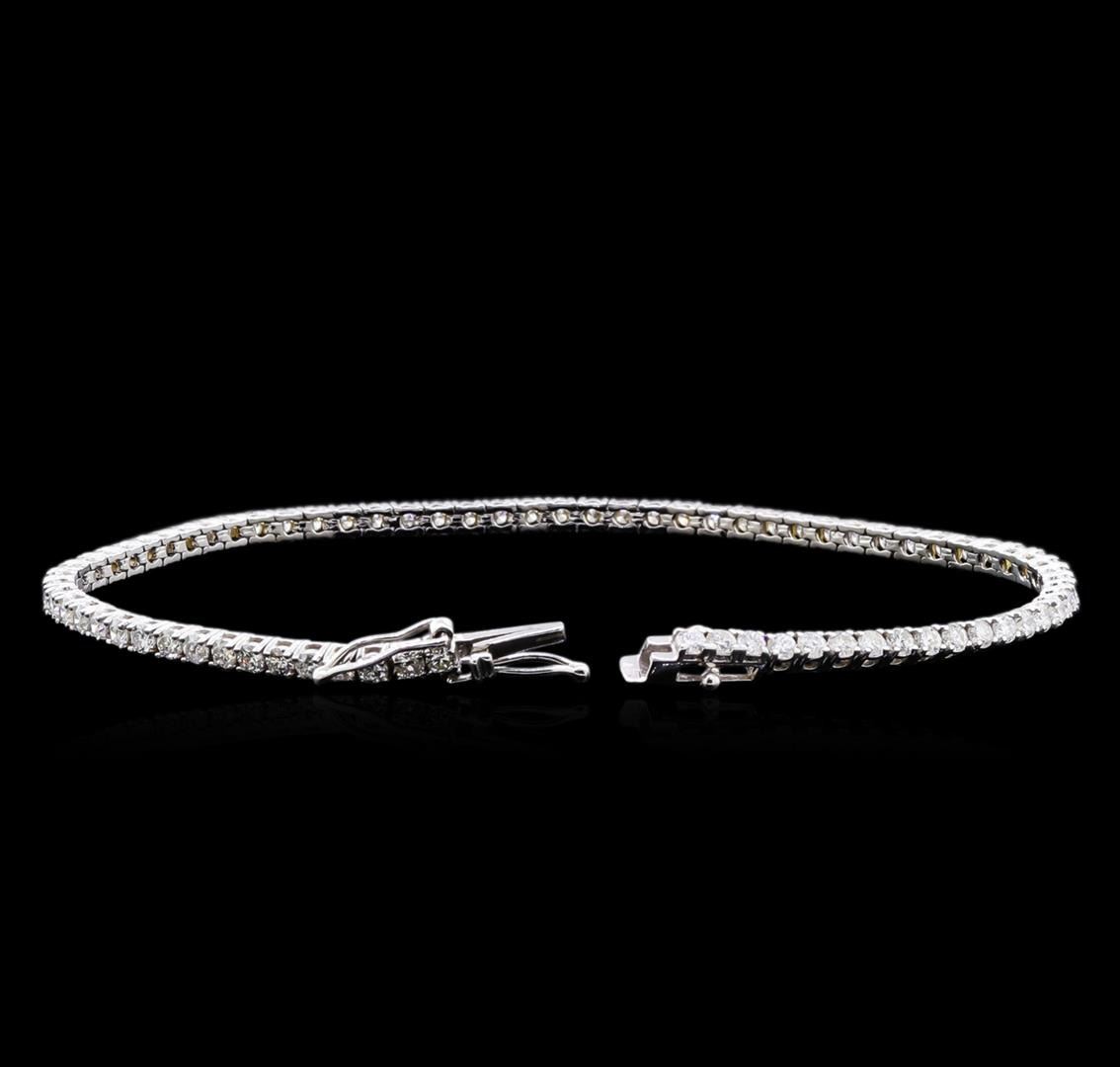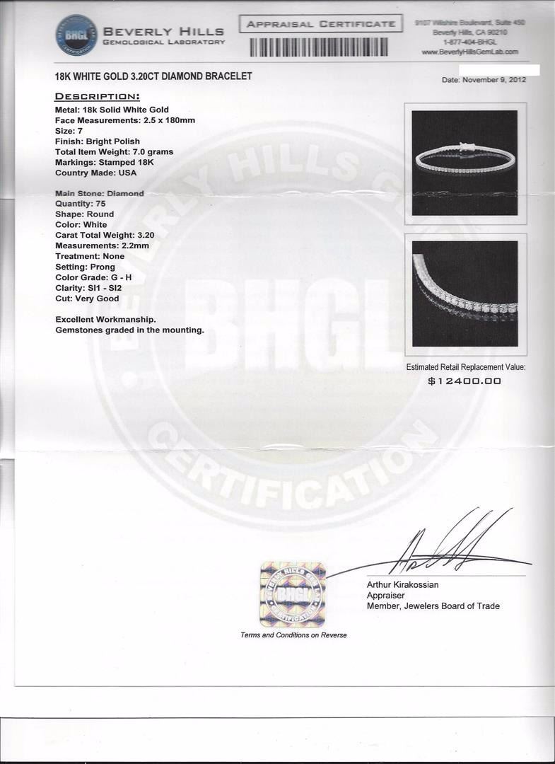 One 18KT white gold 3.20ctw diamond bracelet. Metal: 18KT solid white gold. Face Measurements: 2.5 x 180mm. Size: 7. Finish: Bright polish. Total item weight: 7.0 grams. Markings: Stamped 18K. Country Made: USA. Main Stone: Diamond. Quantity: 75. Shape: Round. Color: White. Carat Total Weight: 3.20ct. Measurements: 2.2mm. Treatment: None. Setting: Prong. Color Grade: G - H. Clarity: SI1 - SI2. Cut: Very good. Condition: Excellent workmanship. Gemstones graded in the mounting. BHGL Appraised at $12,400.00.