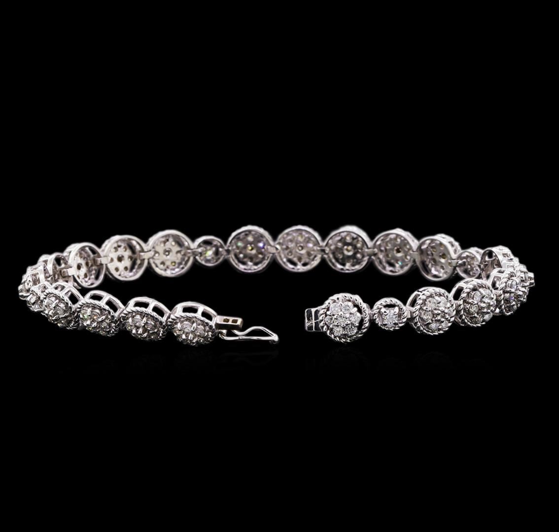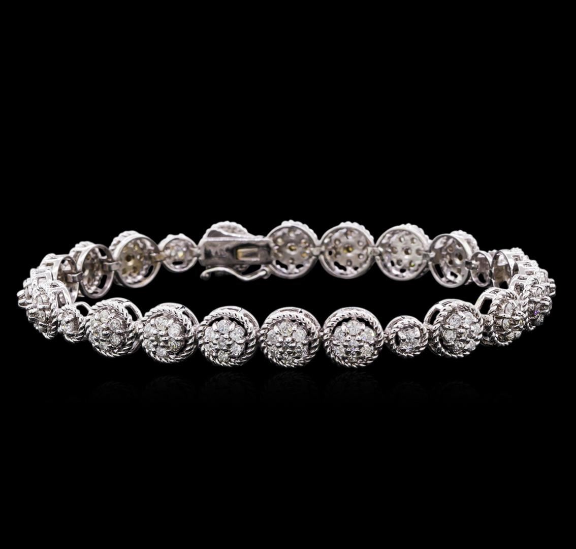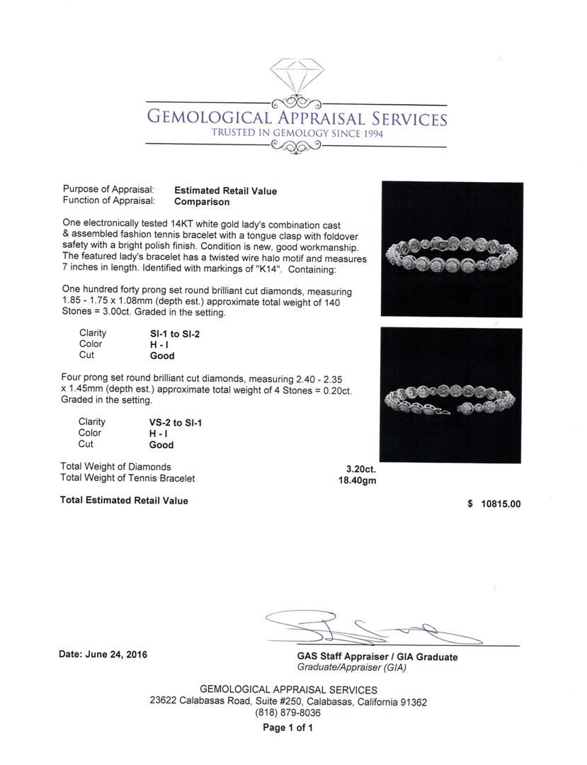 One electronically tested 14KT white gold lady's combination cast & assembled fashion tennis bracelet with a tongue clasp with foldover safety with a bright polish finish. The featured lady's bracelet has a twisted wire halo motif and measures 7 inches in length. Identified with markings of "K14". Condition is new, good workmanship. Containing: One Hundred Forty prong set round brilliant cut diamonds, measuring 1.85 - 1.75 x 1.08mm (depth est.) approximate total weight of 140 Stones = 3.00ct. Graded in the setting. Clarity: SI-1 to SI-2. Color: H - I. Cut Good Four prong set round brilliant cut diamonds, measuring 2.40 - 2.35 x 1.45mm (depth est.) approximate total weight of 4 Stones = 0.20ct. Graded in the setting. Clarity: VS-2 to SI-1. Color: H - I. Cut Good. Total Weight of Diamonds 3.20ct. Total Weight of Tennis Bracelet 18.40gm. GAS Appraised at $10,815.00.