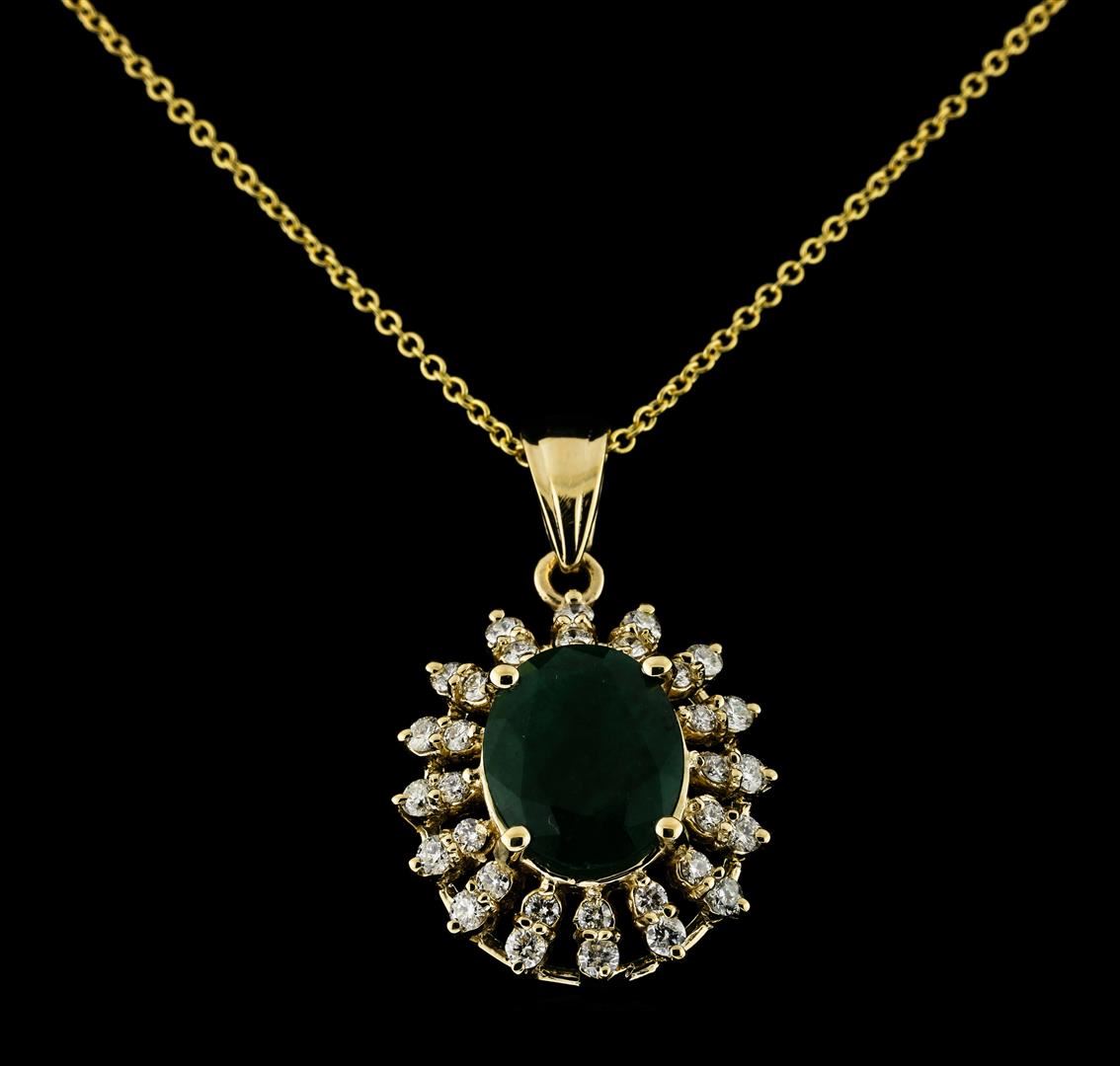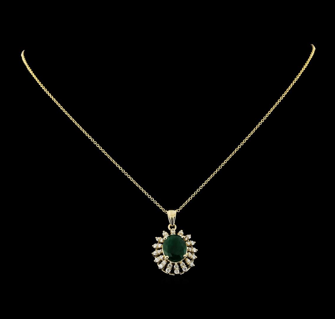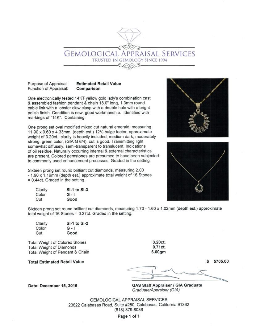 One electronically tested 14KT yellow gold lady's combination cast & assembled fashion pendant & chain 18.0' long, 1.3mm round cable link with a lobster claw clasp with a double halo with a bright polish finish. Identified with markings of '14K'. Condition is new, good workmanship. Containing: One prong set oval modified mixed cut natural emerald, measuring 11.90 x 9.60 x 4.33mm, (depth est.) 12%. bulge factor, approximate weight of 3.20ct., clarity is heavily included, medium dark, moderately strong, green color, (GIA G 6/4), cut is good. Transmitting light somewhat diffusely, semi-transparent to translucent. Indications of oil residue. Naturally occurring internal & external characteristics are present. Colored gemstones are presumed to have been subjected to commonly used enhancement processes. Graded in the setting. Sixteen prong set round brilliant cut diamonds, measuring 2.00 - 1.90 x 1.19mm (depth est.) approximate total weight of 16 Stones = 0.44ct. Graded in the setting. Clarity SI-1 to SI-3. Color: G - I Cut Good Sixteen prong set round brilliant cut diamonds, measuring 1.70 - 1.60 x 1.02mm (depth est.) approximate total weight of 16 Stones = 0.27ct. Graded in the setting. Clarity SI-1 to SI-2. Color: G - I Cut Good. Total Weight of Colored Stones 3.20ct.. Total Weight of Diamonds 0.71ct.. Total Weight of Pendant & Chain 6.60gm. GAS Appraised at $5,705.00.