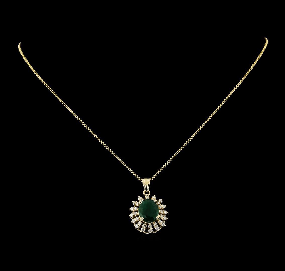 One electronically tested 14KT yellow gold lady's combination cast & assembled fashion pendant & chain 18.0' long, 1.3mm round cable link with a lobster claw clasp with a double halo with a bright polish finish. Identified with markings of '14K'. Condition is new, good workmanship. Containing: One prong set oval modified mixed cut natural emerald, measuring 11.90 x 9.60 x 4.33mm, (depth est.) 12%. bulge factor, approximate weight of 3.20ct., clarity is heavily included, medium dark, moderately strong, green color, (GIA G 6/4), cut is good. Transmitting light somewhat diffusely, semi-transparent to translucent. Indications of oil residue. Naturally occurring internal & external characteristics are present. Colored gemstones are presumed to have been subjected to commonly used enhancement processes. Graded in the setting. Sixteen prong set round brilliant cut diamonds, measuring 2.00 - 1.90 x 1.19mm (depth est.) approximate total weight of 16 Stones = 0.44ct. Graded in the setting. Clarity SI-1 to SI-3. Color: G - I Cut Good Sixteen prong set round brilliant cut diamonds, measuring 1.70 - 1.60 x 1.02mm (depth est.) approximate total weight of 16 Stones = 0.27ct. Graded in the setting. Clarity SI-1 to SI-2. Color: G - I Cut Good. Total Weight of Colored Stones 3.20ct.. Total Weight of Diamonds 0.71ct.. Total Weight of Pendant & Chain 6.60gm. GAS Appraised.