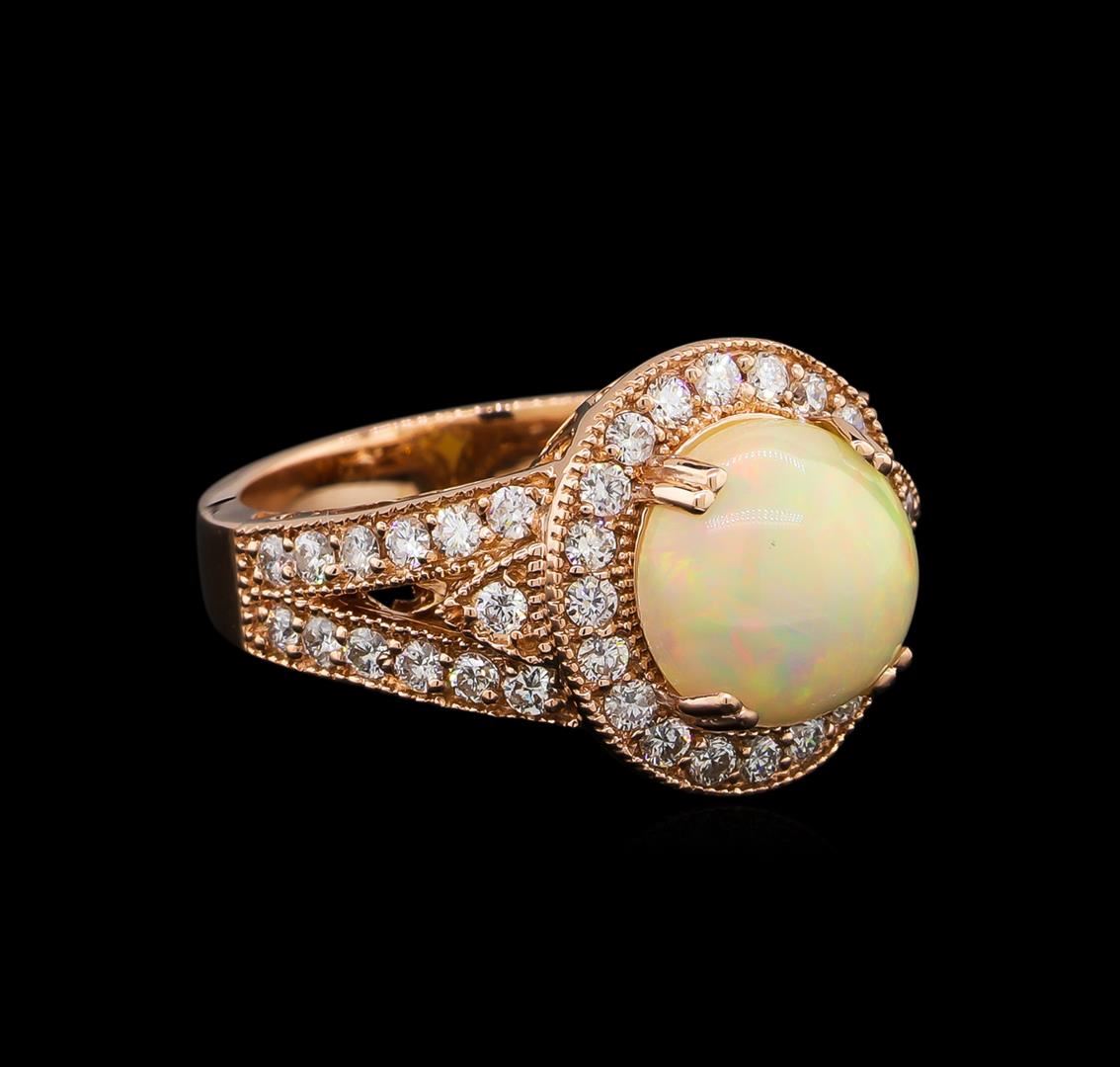 One electronically tested 14KT rose gold lady's cast fashion ring with a split shank halo with a bright polish with milgrain detailing finish. The featured lady's ring has a shank measuring 3.73 millimeters wide. Identified with markings of "K14". Condition is new, good workmanship. Containing: Forty-Six prong set round brilliant cut diamonds, measuring 1.80 - 1.75 x 1.10mm (depth est.) approximate total weight of 46 Stones = 0.98ct. Graded in the setting. Clarity: SI-1 to SI-2. Color: G - Very Good One semi crystal opal that is cut in a round shaped cabochon and is prong set, measuring 10.05 mm long x 10.01 mm wide, and 5.10 mm thick and the approximate weight is 3.20 carats. The opal has a very bright, red multicolor play of color (fire) in a flashfire pattern; a medium dome; a good cut; no inclusions; consistent in its brightness and pattern; and is not directional. Graded in the setting. Total Weight of Diamonds 0.98ct. Total Weight of Opals 3.20ct. Total Weight of Ring 8.30gm GAS Appraised.