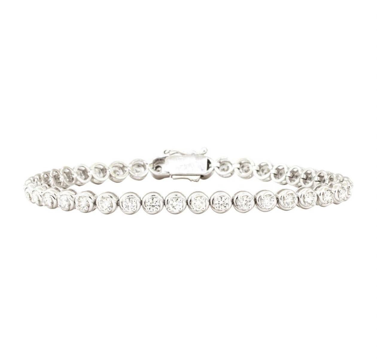One electronically tested 14KT white gold lady's combination cast & assembled fashion straight line tennis bracelet with a tongue clasp & foldover safety with a bezel twist motif with a bright polish finish. The featured lady's tennis bracelet measures 7.00 inches in length Identified with markings of 'K14'. Condition is new, good workmanship. Containing: Thirty-Nine prong set round brilliant cut diamonds, measuring 2.85 - 2.75 x 1.71mm (depth est.) approximate total weight of 39 Stones = 3.20ct. Graded in the setting. Color G - H Clarity VS-2 to SI-1 Cut Very Good. Total Weight of Diamonds 3.20ct.. Total Weight of Tennis Bracelet 12.80gm GAS Appraised at $12820.00. GAS Appraised.