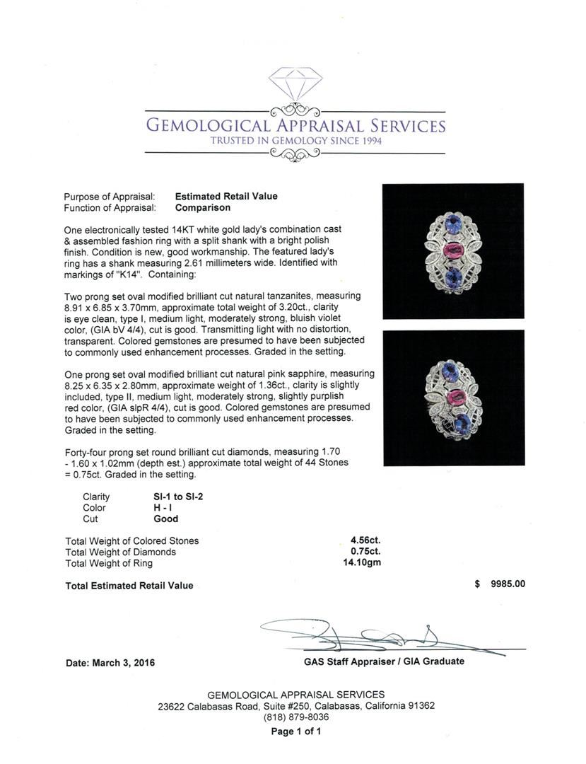 One electronically tested 14KT white gold lady's combination cast & assembled fashion ring with a split shank with a bright polish finish. The featured lady's ring has a shank measuring 2.61 millimeters wide. Identified with markings of "K14". Condition is new, good workmanship. Containing: Two prong set oval modified brilliant cut natural tanzanites, measuring 8.91 x 6.85 x 3.70mm, approximate total weight of 3.20ct., clarity is eye clean, type I, medium light, moderately strong, bluish violet color, (GIA bV 4/4), cut is good. Transmitting light with no distortion, transparent. Colored gemstones are presumed to have been subjected to commonly used enhancement processes. Graded in the setting. One prong set oval modified brilliant cut natural pink sapphire, measuring 8.25 x 6.35 x 2.80mm, approximate weight of 1.36ct., clarity is slightly included, type II, medium light, moderately strong, slightly purplish red color, (GIA slpR 4/4), cut is good. Colored gemstones are presumed to have been subjected to commonly used enhancement processes. Graded in the setting. Forty-Four prong set round brilliant cut diamonds, measuring 1.70 - 1.60 x 1.02mm (depth est.) approximate total weight of 44 Stones = 0.75ct. Graded in the setting. Clarity: SI-1 to SI-2. Color: H - I. Cut Good. Total Weight of Colored Stones 4.56ct. Total Weight of Diamonds 0.75ct. Total Weight of Ring 14.10gm. GAS Appraised at $9,985.00.