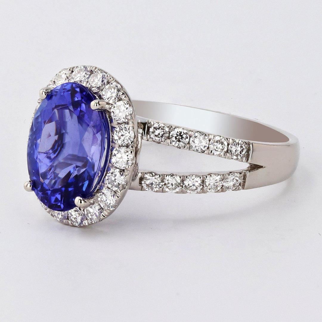 One polished, stamped, and tested platinum ring with a bright finish. The ring is mounted with: 1 genuine tanzanite center stone weighing approximately 3.20 carat, and 38 genuine round diamonds weighing approximately 0.82 carats. This item weighs 6.9 grams, condition is new, excellent workmanship. MAIN GEMSTONE Species: Zoisite Variety: Tanzanite Shape: Oval Cutting Style: Modified Brilliant Cut Measurements: 10.9 x 7.9 x 5.4mm Weight: 3.20 carat Color: Violetish Blue Cut Grade: Very Good Refractive Index: 1.691 - 1.700 DR Birefringence: 0.008 - 0.013 Hardness: 6.5 - 7 ADJACENT GEMSTONES ON RING Identity: Natural Diamond Shape: Round Cutting Style: Brilliant Cut Quantity: 38 Diamonds Measurements: 1.8mm Total Weight: 91 carats Clarity Grade: VS2 to SI1 Color Grade: F - G Refractive Index: 2.418 Hardness: 10 TANZANITE WEIGHT: 3.20ct TOTAL DIAMOND WEIGHT: 0.82ctw WEIGHT OF ITEM: 6.9 grams METAL: Platinum #LREF-4279