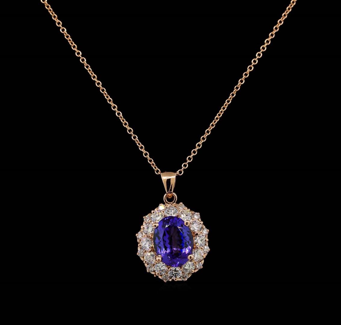 One electronically tested 14KT rose gold lady's combination cast & assembled fashion pendant & chain 18.0' long, 1.3mm oval cable link with a lobster claw clasp with a bright polish finish. Identified with markings of '14K'. Condition is new, good workmanship. Containing: One prong set oval modified brilliant cut natural tanzanite, measuring 10.37 x 8.09 x 5.20mm, (depth est.) 5%. bulge factor, approximate weight of 3.20ct., clarity is eye clean, medium dark, moderately strong, violetish blue color, (GIA vB 6/4), cut is very good. Transmitting light with no distortion, transparent. Colored gemstones are presumed to have been subjected to commonly used enhancement processes. Graded in the setting. Twelve prong set round brilliant cut diamonds, measuring 2.80 - 2.70 x 1.65mm (depth est.) approximate total weight of 12 Stones = 0.92ct. Graded in the setting. Clarity SI-1 to SI-2. Color: H - I Cut Good Twelve prong set round brilliant cut diamonds, measuring 1.70 - 1.65 x 1.04mm (depth est.) approximate total weight of 12 Stones = 0.22ct. Graded in the setting. Clarity SI-1 to SI-2. Color: H - I Cut Good. Total Weight of Colored Stones 3.20ct.. Total Weight of Diamonds 1.14ct.. Total Weight of Pendant & Chain 5.70gm. GAS Appraised at $9,005.00.