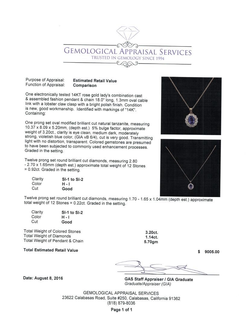 One electronically tested 14KT rose gold lady's combination cast & assembled fashion pendant & chain 18.0' long, 1.3mm oval cable link with a lobster claw clasp with a bright polish finish. Identified with markings of '14K'. Condition is new, good workmanship. Containing: One prong set oval modified brilliant cut natural tanzanite, measuring 10.37 x 8.09 x 5.20mm, (depth est.) 5%. bulge factor, approximate weight of 3.20ct., clarity is eye clean, medium dark, moderately strong, violetish blue color, (GIA vB 6/4), cut is very good. Transmitting light with no distortion, transparent. Colored gemstones are presumed to have been subjected to commonly used enhancement processes. Graded in the setting. Twelve prong set round brilliant cut diamonds, measuring 2.80 - 2.70 x 1.65mm (depth est.) approximate total weight of 12 Stones = 0.92ct. Graded in the setting. Clarity SI-1 to SI-2. Color: H - I Cut Good Twelve prong set round brilliant cut diamonds, measuring 1.70 - 1.65 x 1.04mm (depth est.) approximate total weight of 12 Stones = 0.22ct. Graded in the setting. Clarity SI-1 to SI-2. Color: H - I Cut Good. Total Weight of Colored Stones 3.20ct.. Total Weight of Diamonds 1.14ct.. Total Weight of Pendant & Chain 5.70gm. GAS Appraised at $9,005.00.