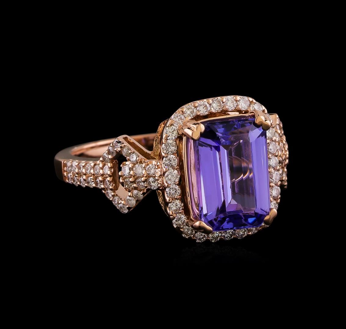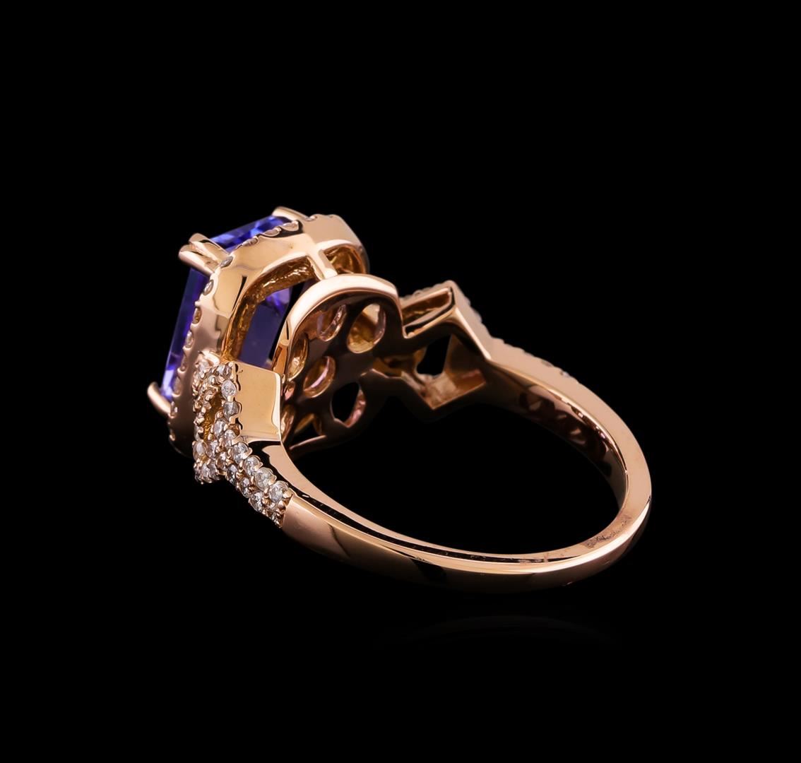 One ring featuring: 14KT rose gold weighing 5.11 grams containing one tanzanite with a total weight of 3.2ct and diamonds with a total weight of 0.50ctw.