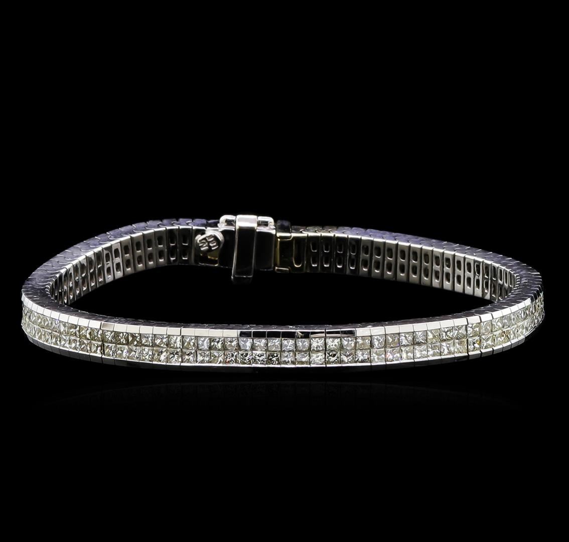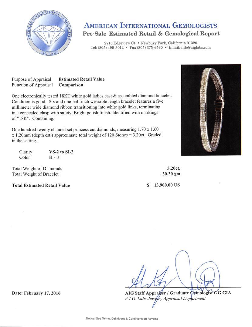 One electronically tested 18KT white gold ladies cast & assembled diamond bracelet. Six and one-half inch wearable length bracelet features a five millimeter wide diamond ribbon transitioning into white gold links, terminating in a concealed clasp with safety. Bright polish finish. Identified with markings of "18K". Condition is good. Containing: One Hundred Twenty channel set princess cut diamonds, measuring 1.70 x 1.60 x 1.20mm (depth est.) approximate total weight of 120 Stones = 3.20ct. Graded in the setting. Clarity: VS-2 to SI-2. Color: H - J. Total Weight of Diamonds 3.20ct. Total Weight of Bracelet 30.30gm. AIG Appraised at $13,900.00.