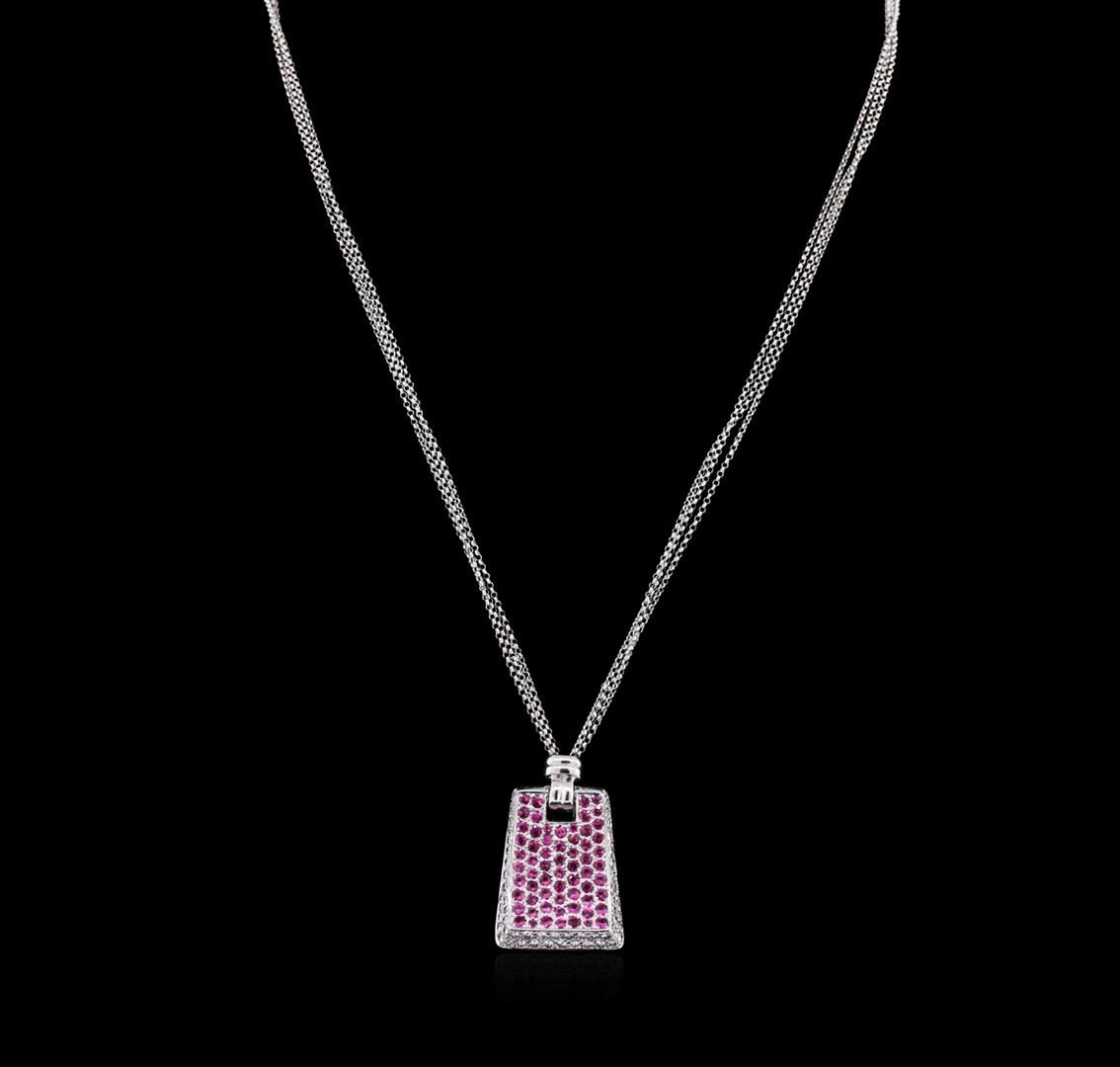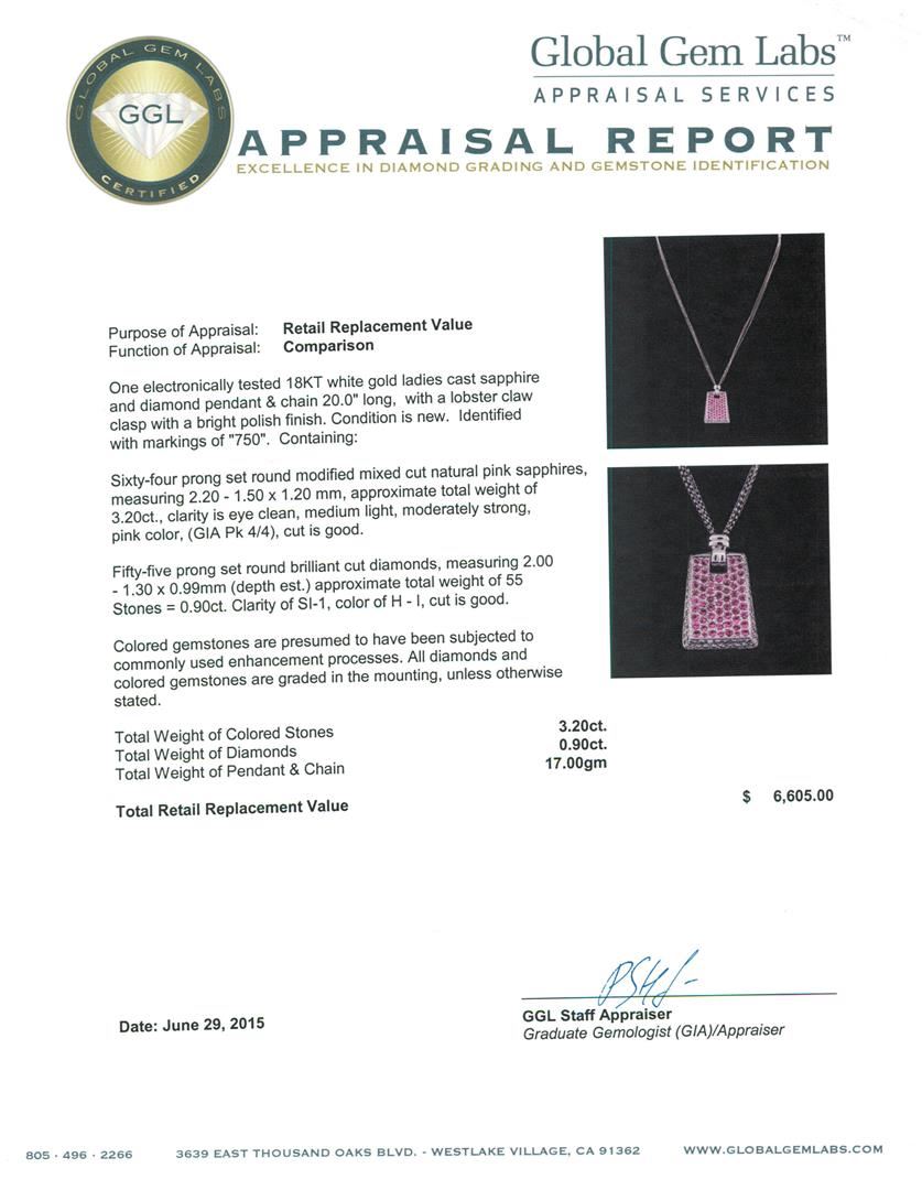 One electronically tested 18KT white gold ladies cast sapphire and diamond pendant & chain 20.0" long, with a lobster claw clasp with a bright polish finish. Identified with markings of "750". Condition is new. Containing: Sixty-four prong set round modified mixed cut natural pink sapphires, measuring 2.20 - 1.50 x 1.20 mm, approximate total weight of 3.20ct., clarity is eye clean, medium light, moderately strong, pink color, (GIA Pk 4/4), cut is good. Fifty-Five prong set round brilliant cut diamonds, measuring 2.00 - 1.30 x 0.99mm (depth est.) approximate total weight of 55 Stones = 0.90ct. Clarity: SI-1. Color: H - I, Cut is Good. Colored gemstones are presumed to have been subjected to commonly used enhancement processes. All diamonds and colored gemstones are graded in the mounting, unless otherwise stated. Total Weight of Colored Stones 3.20ct. Total Weight of Diamonds 0.90ct. Total Weight of Pendant & Chain 17.00 grams. GGL Appraised at $6,605.00.