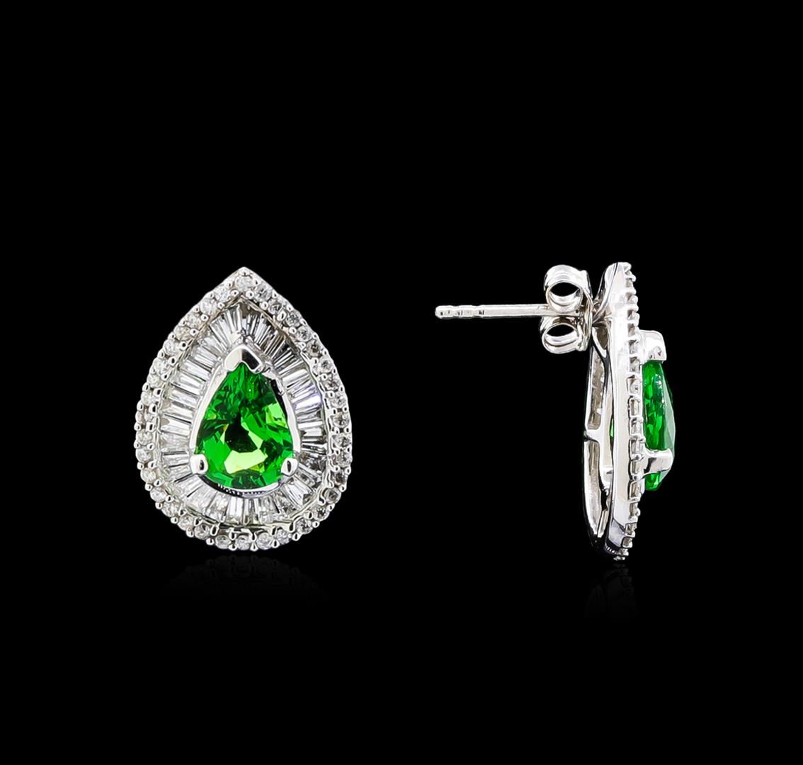 One pair of earrings featuring: 14KT white gold weighing 5.00 grams containing two tsavorites with a total weight of 3.20ct and baguette/round diamonds with a total weight of 1.90ct.