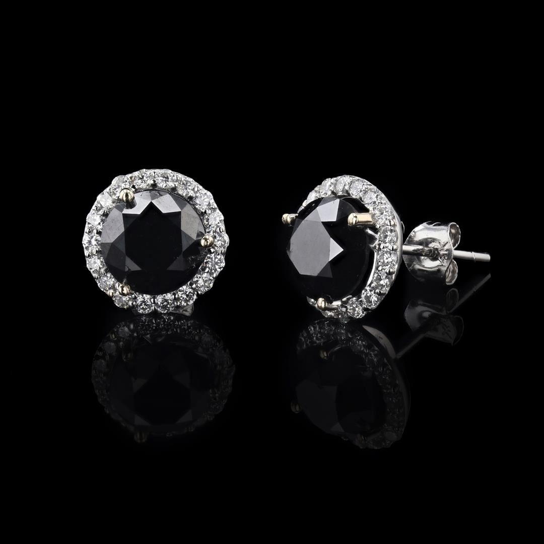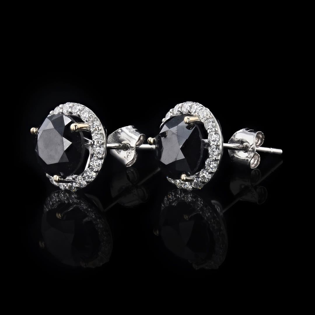 3.21ctw Round Black Diamonds and 0.39ctw White Diamond Halo Stud Earrings. Please see Photos and Description for all available information. This pair of earrings features 36 round brilliant cut diamonds weighing 0.39ctw and 2 black diamonds weighing 3.21ctw, all set in 18K white gold mounting. These earrings are the perfect combination of elegance and glamour.
