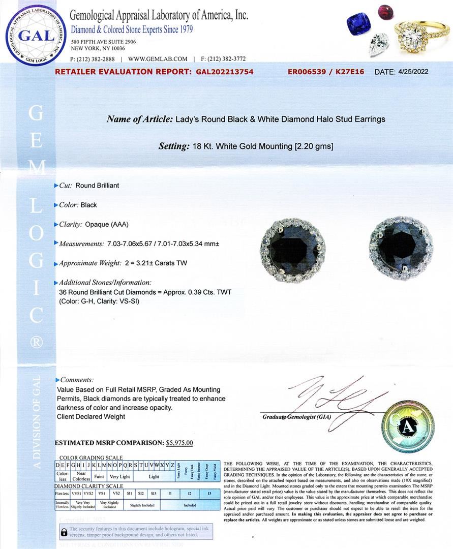 3.21ctw Round Black Diamonds and 0.39ctw White Diamond Halo Stud Earrings. Please see Photos and Description for all available information. This pair of earrings features 36 round brilliant cut diamonds weighing 0.39ctw and 2 black diamonds weighing 3.21ctw, all set in 18K white gold mounting. These earrings are the perfect combination of elegance and glamour.