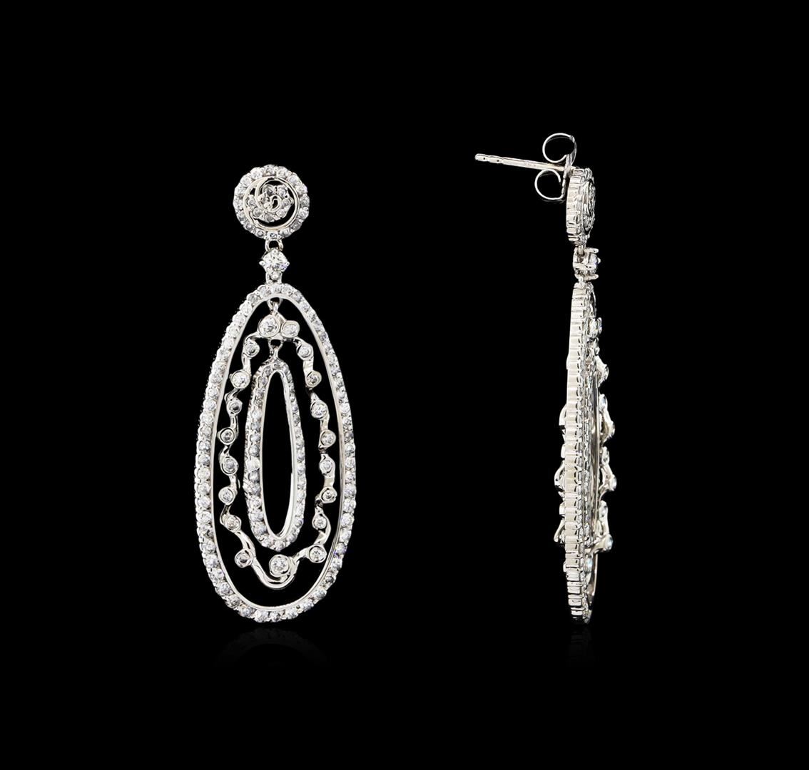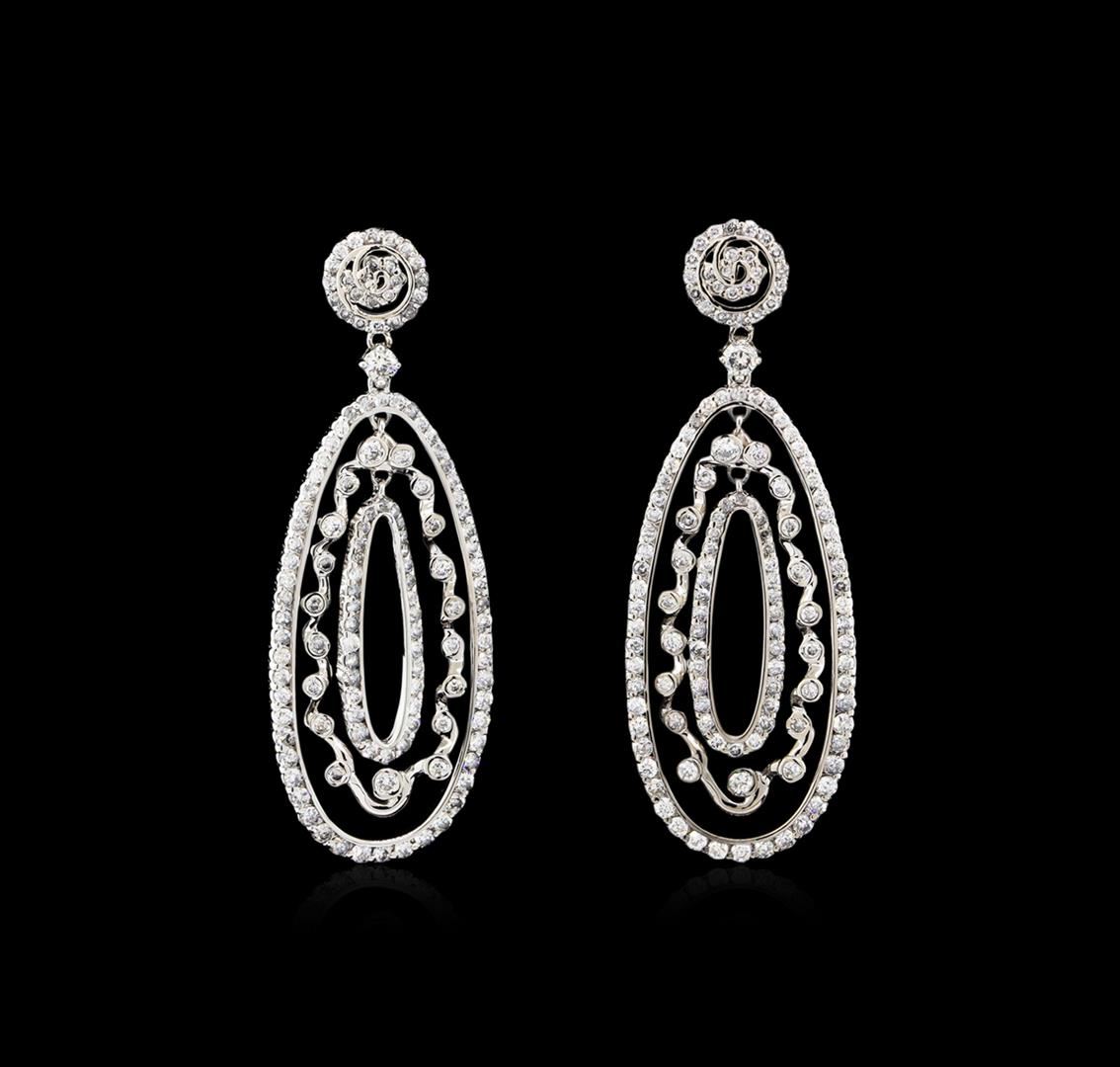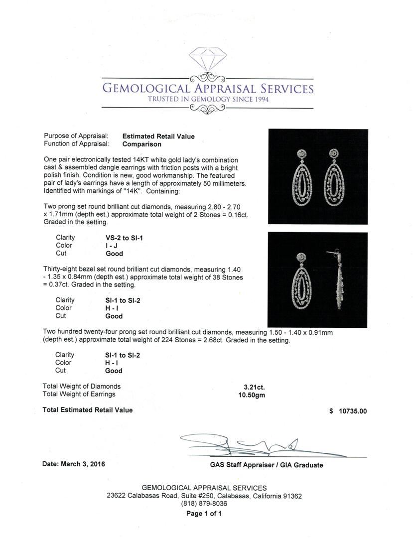 One pair electronically tested 14KT white gold lady's combination cast & assembled dangle earrings with friction posts with a bright polish finish. The featured pair of lady's earrings have a length of approximately 50 millimeters. Identified with markings of "14K". Condition is new, good workmanship. Containing: Two prong set round brilliant cut diamonds, measuring 2.80 - 2.70 x 1.71mm (depth est.) approximate total weight of 2 Stones = 0.16ct. Graded in the setting. Clarity: VS-2 to SI-1. Color: I - J. Cut Good Thirty-Eight bezel set round brilliant cut diamonds, measuring 1.40 - 1.35 x 0.84mm (depth est.) approximate total weight of 38 Stones = 0.37ct. Graded in the setting. Clarity: SI-1 to SI-2. Color: H - I. Cut Good Two Hundred Twenty-Four prong set round brilliant cut diamonds, measuring 1.50 - 1.40 x 0.91mm (depth est.) approximate total weight of 224 Stones = 2.68ct. Graded in the setting. Clarity: SI-1 to SI-2. Color: H - I. Cut Good. Total Weight of Diamonds 3.21ct. Total Weight of Earrings 10.50gm. GAS Appraised at $10,735.00.