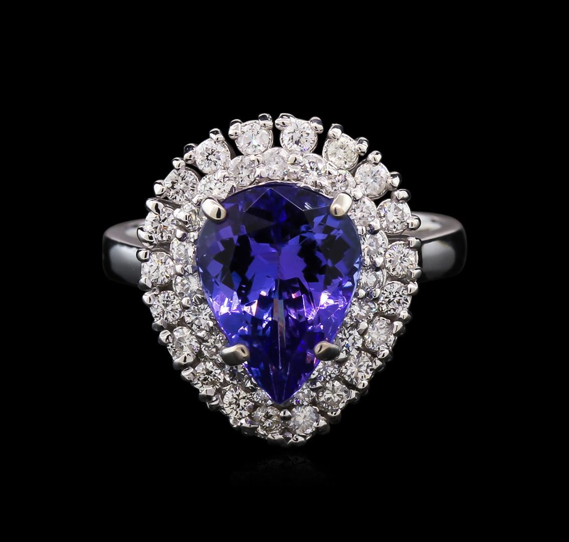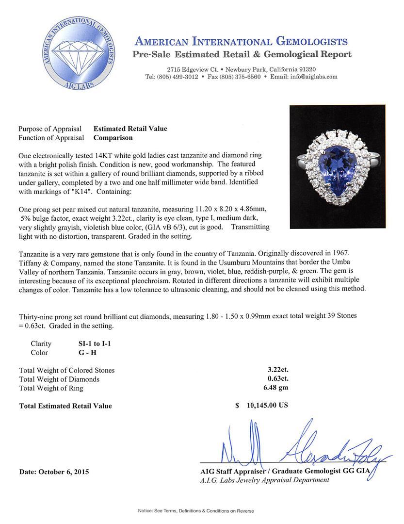 One electronically tested 14KT white gold ladies cast tanzanite and diamond ring with a bright polish finish. The featured tanzanite is set within a gallery of round brilliant diamonds, supported by a ribbed under gallery, completed by a two and one half millimeter wide band. Identified with markings of "K14". Condition is new, good workmanship. Containing: One prong set pear mixed cut natural tanzanite, measuring 11.20 x 8.20 x 4.86mm, 5% bulge factor, exact weight 3.22ct., clarity is eye clean, type I, medium dark, very slightly grayish, violetish blue color, (GIA vB 6/3), cut is good. Transmitting light with no distortion, transparent. Graded in the setting. Tanzanite is a very rare gemstone that is only found in the country of Tanzania. Originally discovered in 1967. Tiffany & Company, named the stone Tanzanite. It is found in the Usumburu Mountains that border the Umba Valley of northern Tanzania. Tanzanite occurs in gray, brown, violet, blue, reddish-purple, & green. The gem is interesting because of its exceptional pleochroism. Rotated in different directions a tanzanite will exhibit multiple changes of color. Tanzanite has a low tolerance to ultrasonic cleaning, and should not be cleaned using this method. Thirty-Nine prong set round brilliant cut diamonds, measuring 1.80 - 1.50 x 0.99mm exact total weight 39 Stones = 0.63ct. Graded in the setting. Clarity: SI-1 to I-1. Color: G - H. Total Weight of Colored Stones 3.22ct. Total Weight of Diamonds 0.63ct. Total Weight of Ring 6.48gm. AIG Appraised at $10,145.00.