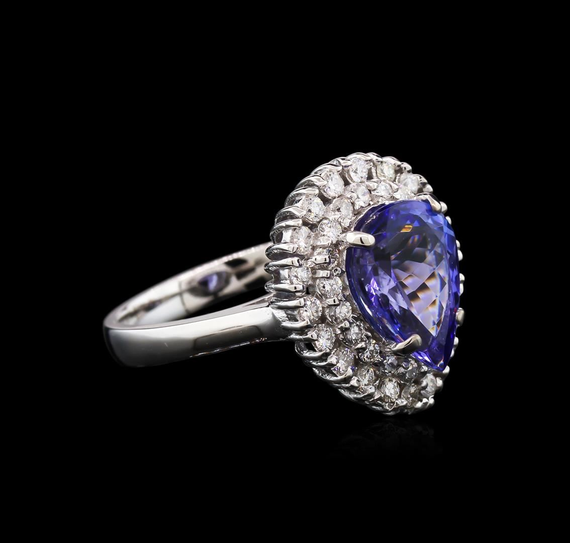 One electronically tested 14KT white gold ladies cast tanzanite and diamond ring with a bright polish finish. The featured tanzanite is set within a gallery of round brilliant diamonds, supported by a ribbed under gallery, completed by a two and one half millimeter wide band. Identified with markings of "K14". Condition is new, good workmanship. Containing: One prong set pear mixed cut natural tanzanite, measuring 11.20 x 8.20 x 4.86mm, 5% bulge factor, exact weight 3.22ct., clarity is eye clean, type I, medium dark, very slightly grayish, violetish blue color, (GIA vB 6/3), cut is good. Transmitting light with no distortion, transparent. Graded in the setting. Tanzanite is a very rare gemstone that is only found in the country of Tanzania. Originally discovered in 1967. Tiffany & Company, named the stone Tanzanite. It is found in the Usumburu Mountains that border the Umba Valley of northern Tanzania. Tanzanite occurs in gray, brown, violet, blue, reddish-purple, & green. The gem is interesting because of its exceptional pleochroism. Rotated in different directions a tanzanite will exhibit multiple changes of color. Tanzanite has a low tolerance to ultrasonic cleaning, and should not be cleaned using this method. Thirty-Nine prong set round brilliant cut diamonds, measuring 1.80 - 1.50 x 0.99mm exact total weight 39 Stones = 0.63ct. Graded in the setting. Clarity: SI-1 to I-1. Color: G - H. Total Weight of Colored Stones 3.22ct. Total Weight of Diamonds 0.63ct. Total Weight of Ring 6.48gm. AIG Appraised at $10,145.00.