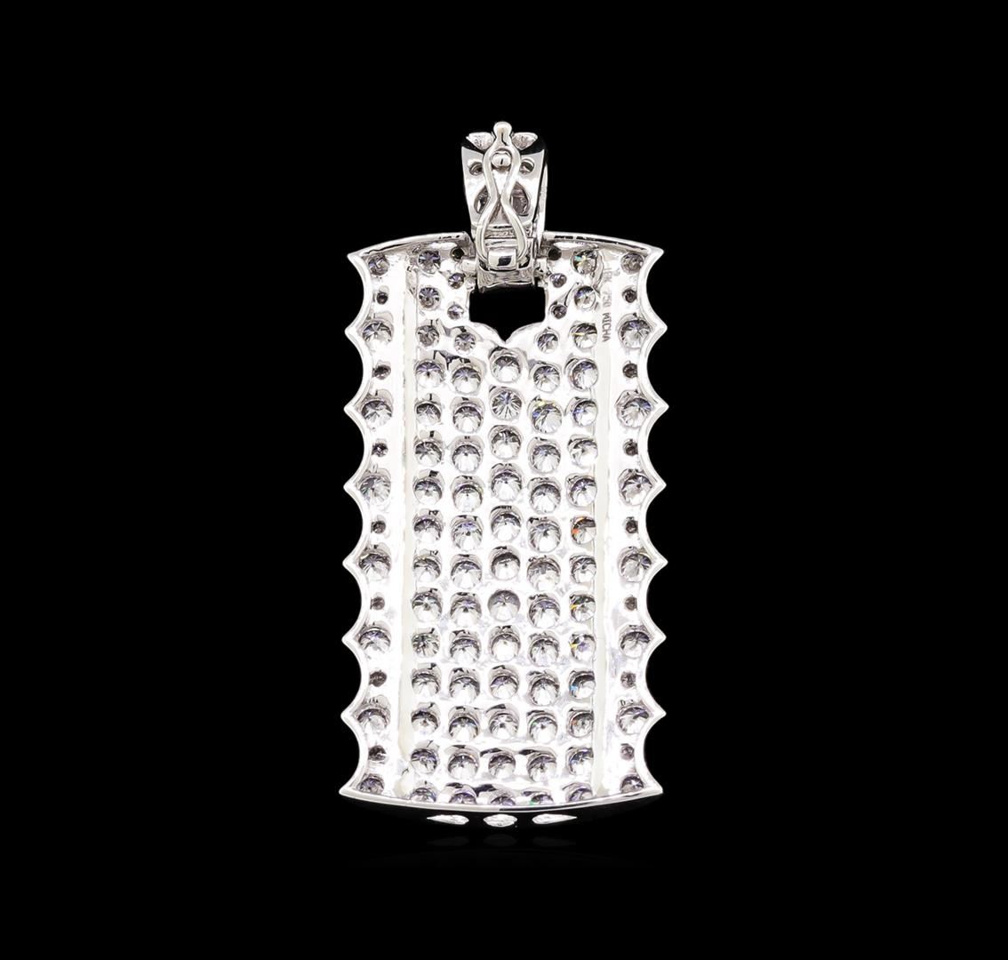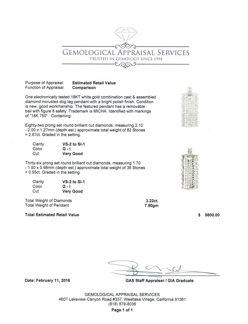 One electronically tested 18KT white gold combination cast & assembled diamond incrusted dog tag pendant with a bright polish finish. The featured pendant has a removable bail with figure 8 safety. Trademark is MICHA. Identified with markings of "18K 750". Condition is new, good workmanship. Containing: Eighty-Two prong set round brilliant cut diamonds, measuring 2.10 - 2.00 x 1.27mm (depth est.) approximate total weight of 82 Stones = 2.67ct. Graded in the setting. Clarity: VS-2 to SI-1. Color: G - I. Cut Very Good Thirty-Six prong set round brilliant cut diamonds, measuring 1.70 - 1.50 x 0.98mm (depth est.) approximate total weight of 36 Stones = 0.55ct. Graded in the setting. Clarity: VS-2 to SI-1. Color: G - I. Cut Very Good. Total Weight of Diamonds 3.22ct. Total Weight of Pendant 7.90gm. GAS Appraised at $9,800.00.