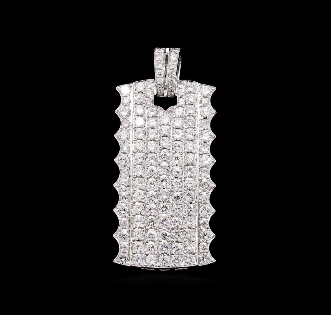 One electronically tested 18KT white gold combination cast & assembled diamond incrusted dog tag pendant with a bright polish finish. The featured pendant has a removable bail with figure 8 safety. Trademark is MICHA. Identified with markings of "18K 750". Condition is new, good workmanship. Containing: Eighty-Two prong set round brilliant cut diamonds, measuring 2.10 - 2.00 x 1.27mm (depth est.) approximate total weight of 82 Stones = 2.67ct. Graded in the setting. Clarity: VS-2 to SI-1. Color: G - I. Cut Very Good Thirty-Six prong set round brilliant cut diamonds, measuring 1.70 - 1.50 x 0.98mm (depth est.) approximate total weight of 36 Stones = 0.55ct. Graded in the setting. Clarity: VS-2 to SI-1. Color: G - I. Cut Very Good. Total Weight of Diamonds 3.22ct. Total Weight of Pendant 7.90gm. GAS Appraised at $9,800.00.