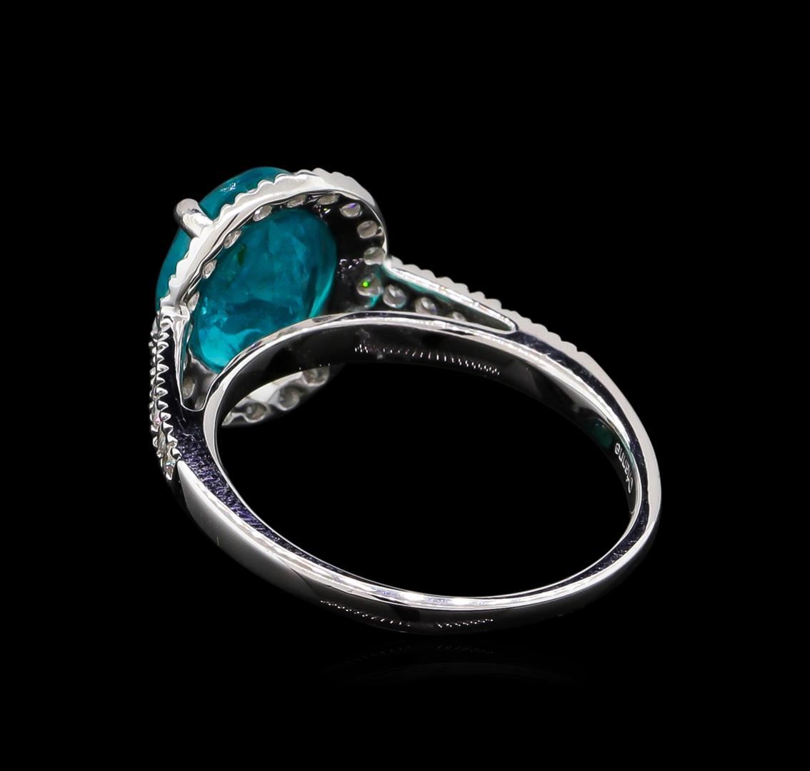 One electronically tested 14KT white gold lady's cast fashion ring with a cathedral halo with a bright polish finish. The featured ladies ring has a shank measuring 1.70 millimeters in width. Trademark is Orianne. Identified with markings of "14K". Condition is new, good workmanship. Containing: One prong set oval modified brilliant cut natural apatite, measuring 9.82 x 7.72 x 6.00mm, 5%. bulge factor, approximate weight of 3.23ct., clarity is moderately included, medium dark, moderately strong, bluish green color, (GIA bG 6/4), cut is good. Transmitting light with a minimum of distortion, transparent. Colored gemstones are presumed to have been subjected to commonly used enhancement processes. Graded in the setting. Twelve prong set round brilliant cut diamonds, measuring 1.60 - 1.50 x 0.98mm (depth est.) approximate total weight of 12 Stones = 0.18ct. Graded in the setting. Clarity: SI-2 to I-1. Color: H - I. Cut Good Twenty prong set round brilliant cut diamonds, measuring 1.30 - 1.20 x 0.79mm (depth est.) approximate total weight of 20 Stones = 0.15ct. Graded in the setting. Clarity: SI-2 to I-1. Color: H - I. Cut Good. Total Weight of Colored Stones 3.23ct. Total Weight of Diamonds 0.33ct. Total Weight of Ring 3.40gm. GAS Appraised at $3,480.00.