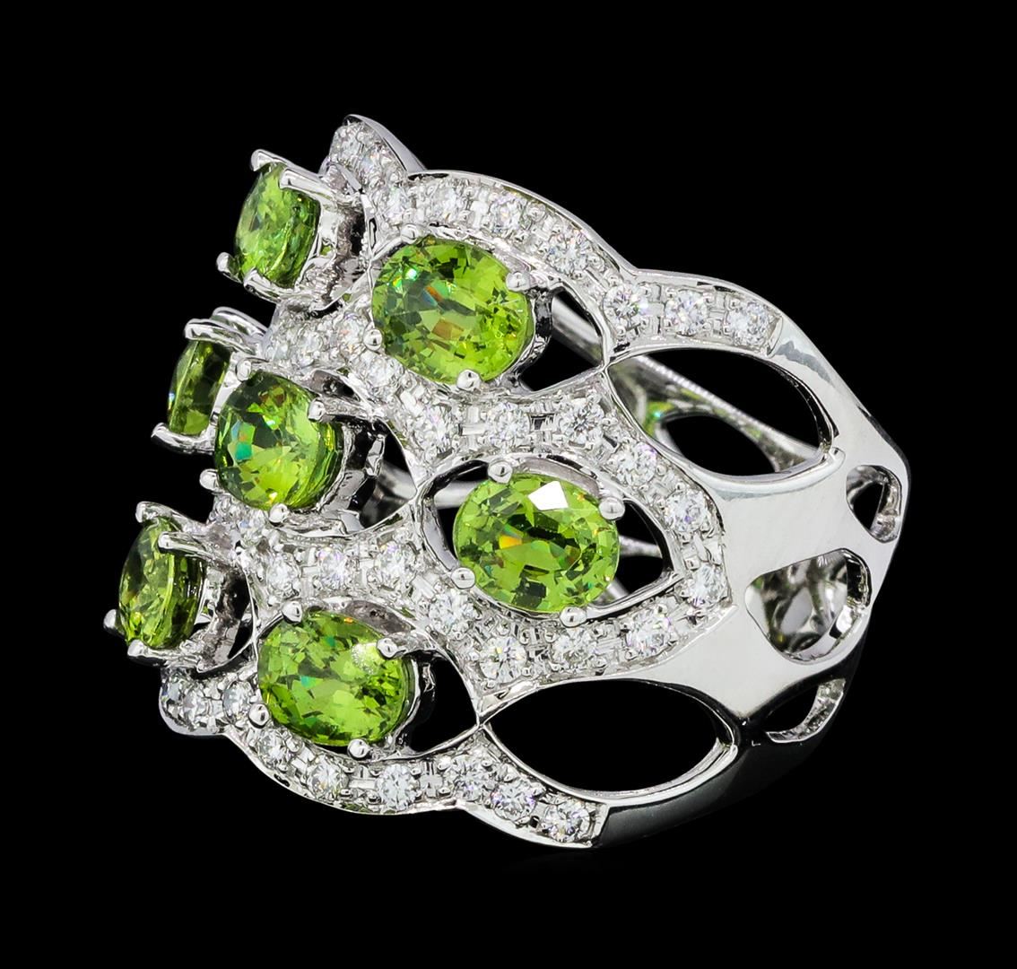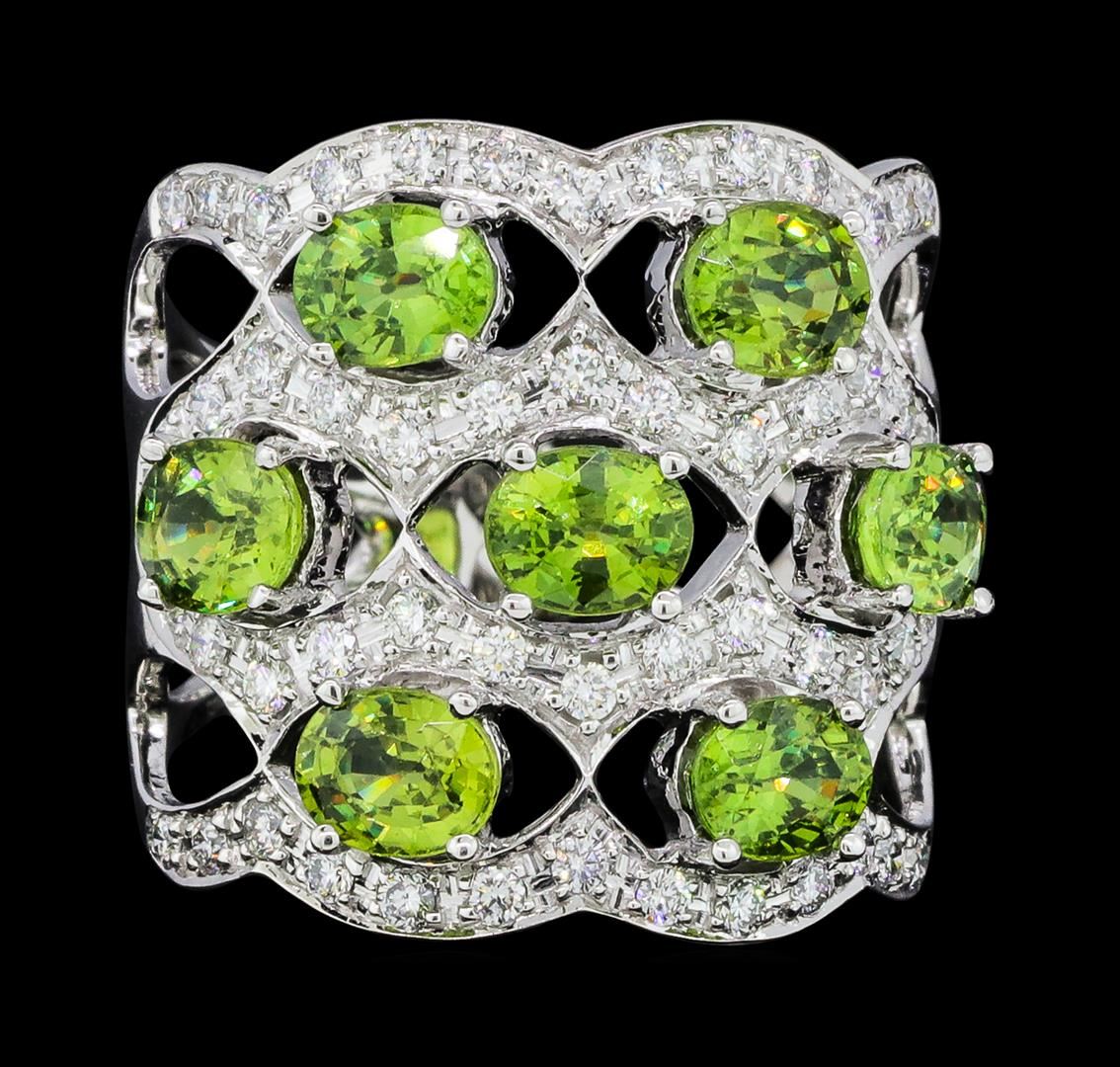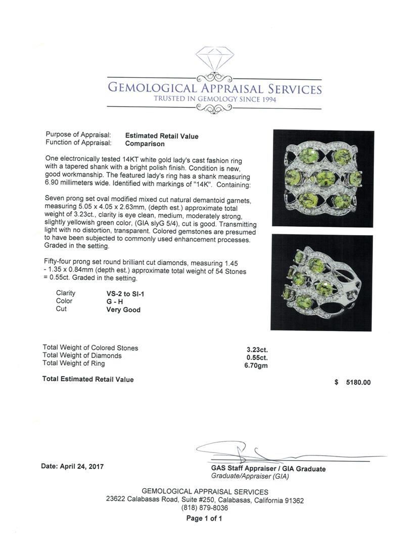 One electronically tested 14KT white gold lady's cast fashion ring with a tapered shank with a bright polish finish. The featured lady's ring has a shank measuring 6.90 millimeters wide. Identified with markings of '14K'. Condition is new, good workmanship. Containing: Seven prong set oval modified mixed cut natural demantoid garnets, measuring 5.05 x 4.05 x 2.63mm, (depth est.) approximate total weight of 3.23ct., clarity is eye clean, medium, moderately strong, slightly yellowish green color, (GIA slyG 5/4), cut is good. Transmitting light with no distortion, transparent. Colored gemstones are presumed to have been subjected to commonly used enhancement processes. Graded in the setting. Fifty-Four prong set round brilliant cut diamonds, measuring 1.45 - 1.35 x 0.84mm (depth est.) approximate total weight of 54 Stones = 0.55ct. Graded in the setting. Color G - H Clarity VS-2 to SI-1 Cut Very Good. Total Weight of Colored Stones 3.23ct.. Total Weight of Diamonds 0.55ct.. Total Weight of Ring 6.70gm GAS Appraised at $5180.00. GAS Appraised at $5,180.00.