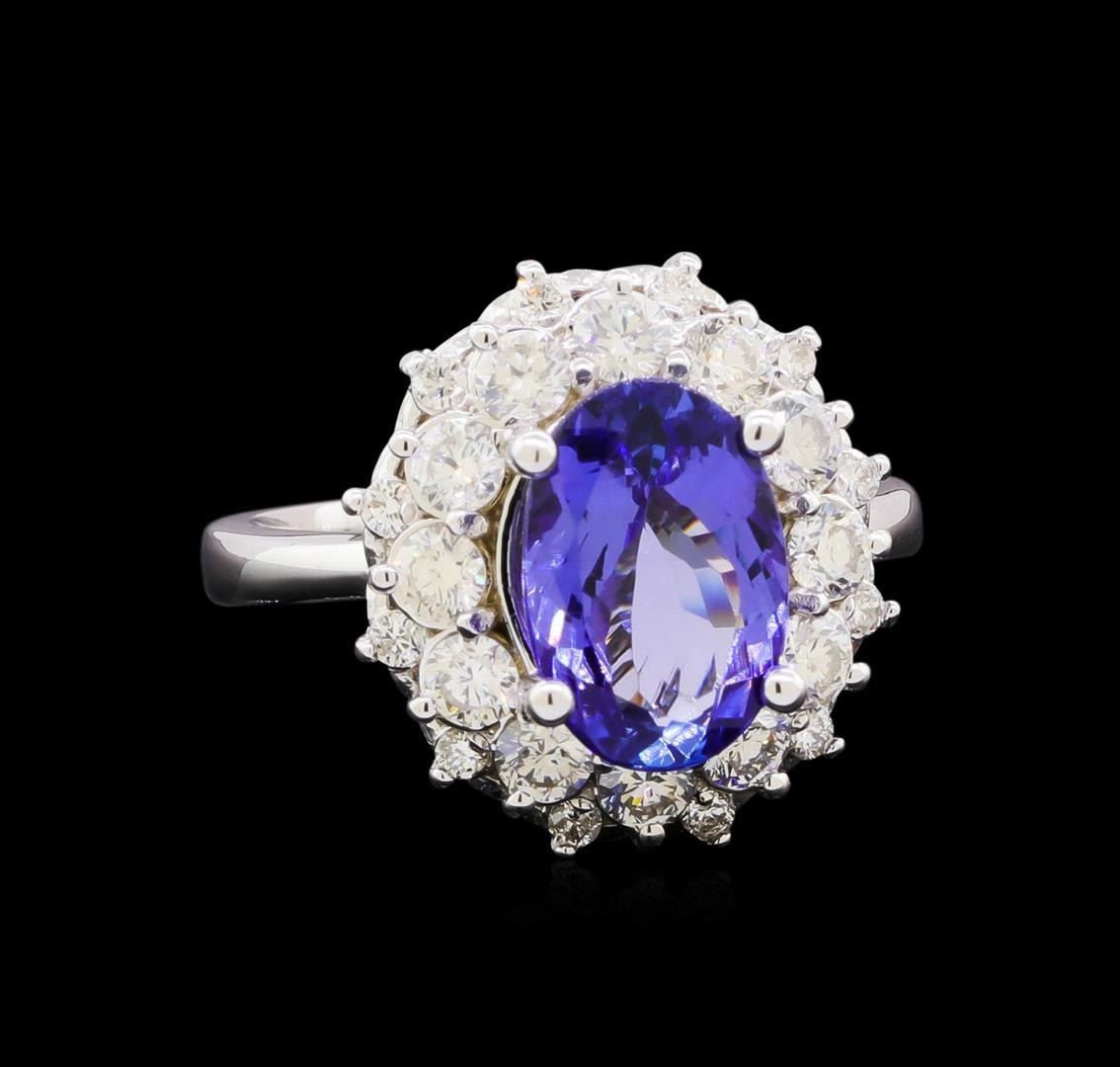 One electronically tested 14KT white gold lady's cast fashion ring with a double basket halo with a bright polish finish. The featured lady's ring has a shank measuring 2.69 millimeters in width. Identified with markings of "K14". Condition is new, good workmanship. Containing: One prong set oval modified brilliant cut natural tanzanite, measuring 11.15 x 7.91 x 4.58mm, (depth est.) 8%. bulge factor, approximate weight of 3.23ct., clarity is eye clean, medium, moderately strong, bluish violet color, (GIA bV 5/4), cut is good. Transmitting light with no distortion, transparent. Colored gemstones are presumed to have been subjected to commonly used enhancement processes. Graded in the setting. Twelve prong set round brilliant cut diamonds, measuring 2.95 - 2.90 x 1.76mm (depth est.) approximate total weight of 12 Stones = 1.00 ct. Graded in the setting. Graded in the setting. Clarity: VS-2 to SI-1. Color: H - I. Cut Very Good Twelve prong set round brilliant cut diamonds, measuring 1.60 - 1.50 x 0.93mm (depth est.) approximate total weight of 12 Stones = 0.18ct. Graded in the setting. Clarity: SI-1 to SI-2. Color: H - I. Cut Good. Total Weight of Colored Stones 3.23ct. Total Weight of Diamonds 1.18ct. Total Weight of Ring 6.90gm. GAS Appraised.