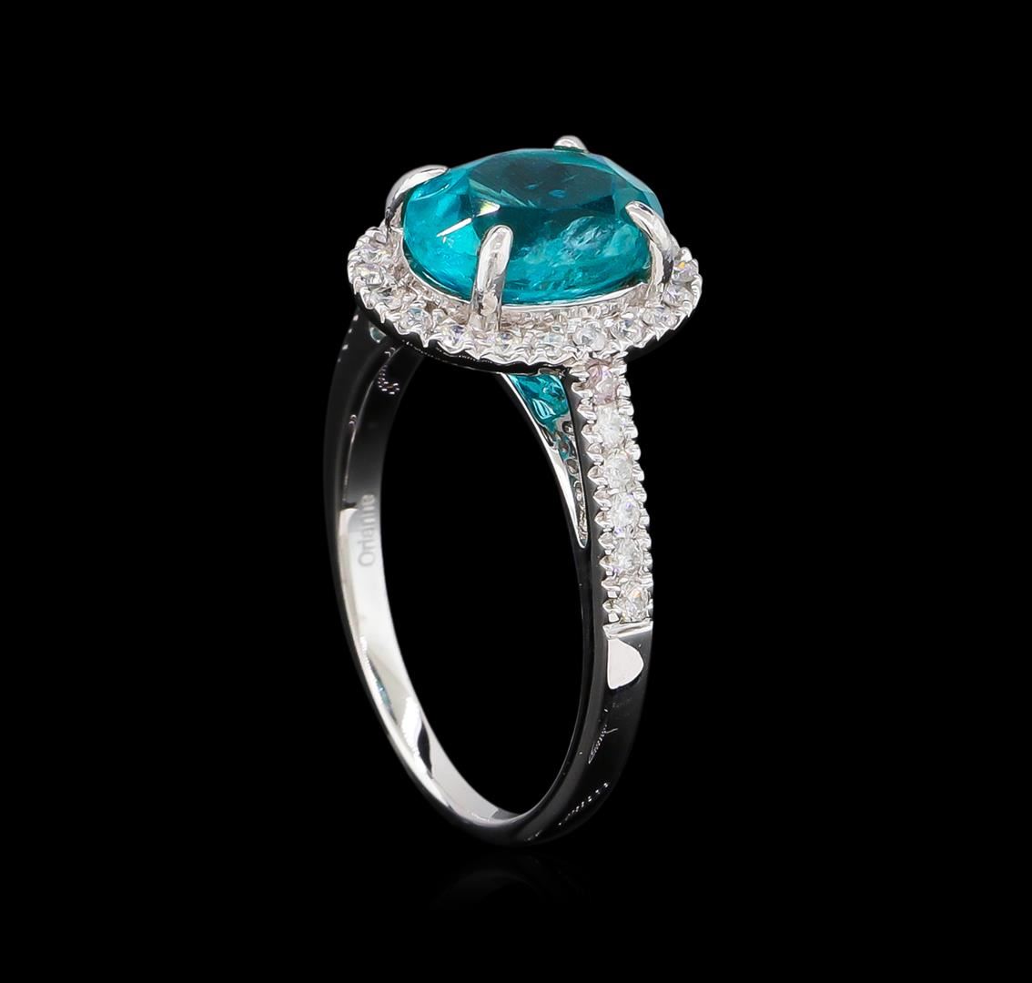 One electronically tested 14KT white gold lady's cast fashion ring with a cathedral halo with a bright polish finish. The featured ladies ring has a shank measuring 1.70 millimeters in width. Trademark is Orianne. Identified with markings of "14K". Condition is new, good workmanship. Containing: One prong set oval modified brilliant cut natural apatite, measuring 9.82 x 7.72 x 6.00mm, 5%. bulge factor, approximate weight of 3.23ct., clarity is moderately included, medium dark, moderately strong, bluish green color, (GIA bG 6/4), cut is good. Transmitting light with a minimum of distortion, transparent. Colored gemstones are presumed to have been subjected to commonly used enhancement processes. Graded in the setting. Twelve prong set round brilliant cut diamonds, measuring 1.60 - 1.50 x 0.98mm (depth est.) approximate total weight of 12 Stones = 0.18ct. Graded in the setting. Clarity: SI-2 to I-1. Color: H - I. Cut Good Twenty prong set round brilliant cut diamonds, measuring 1.30 - 1.20 x 0.79mm (depth est.) approximate total weight of 20 Stones = 0.15ct. Graded in the setting. Clarity: SI-2 to I-1. Color: H - I. Cut Good. Total Weight of Colored Stones 3.23ct. Total Weight of Diamonds 0.33ct. Total Weight of Ring 3.40gm. GAS Appraised at $3,480.00.