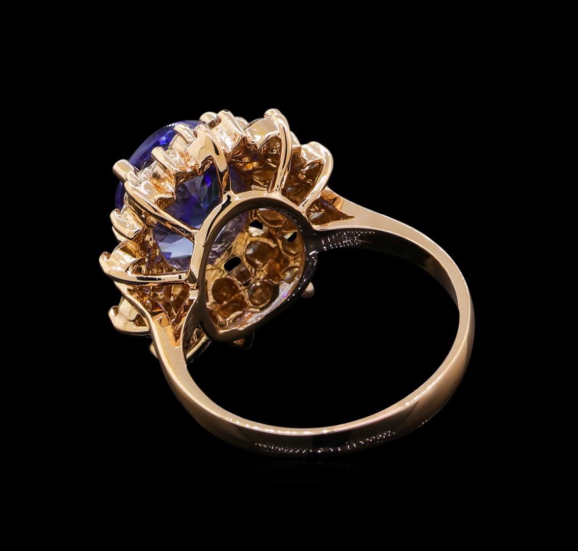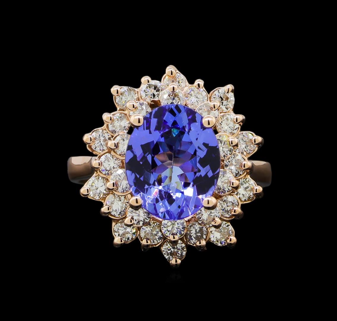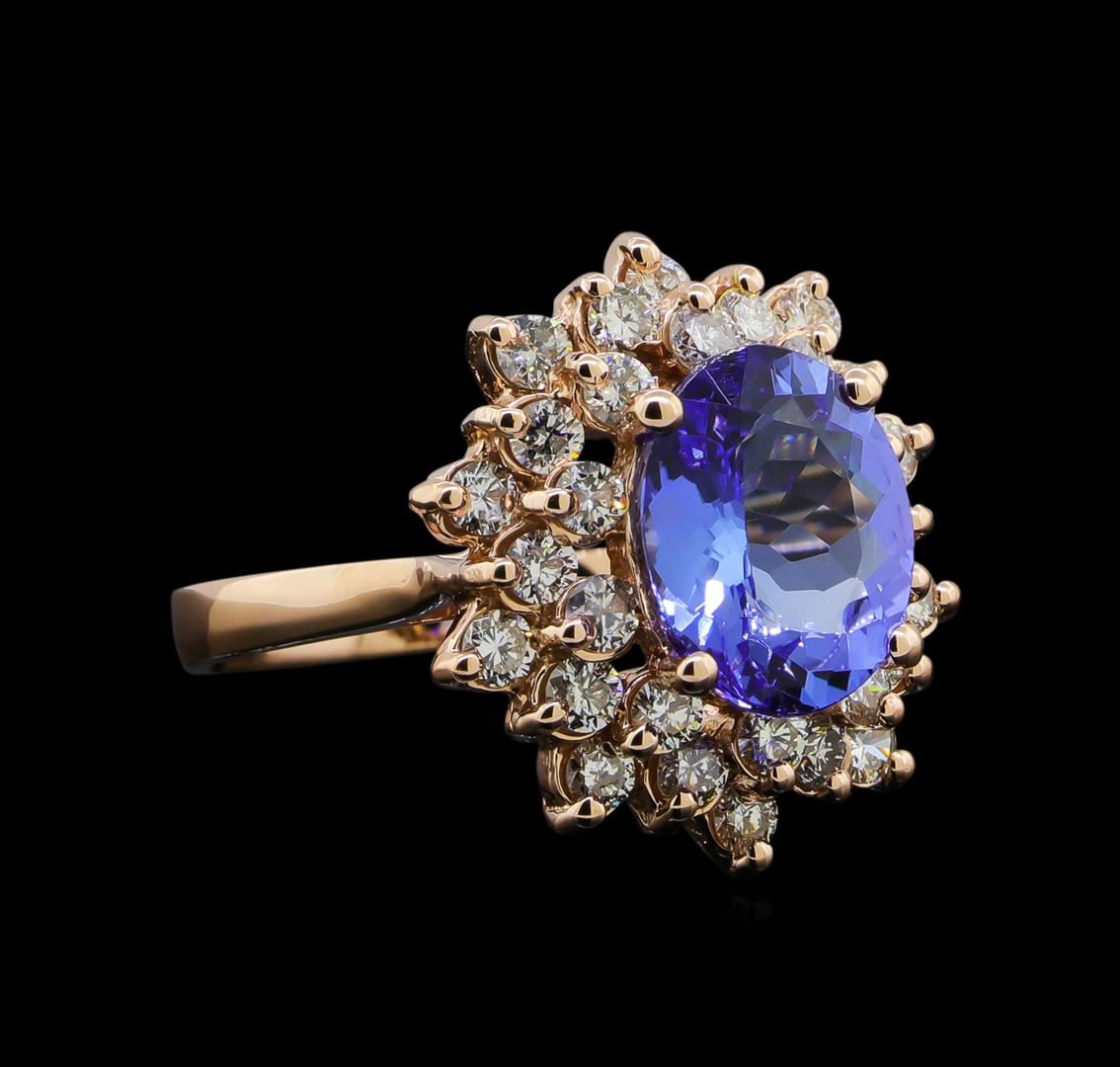 One electronically tested 14KT rose gold lady's cast fashion ring with a basket halo with a bright polish finish. The featured lady's ring has a shank measuring 2.36 millimeters wide. Identified with markings of 'K14'. Condition is new, good workmanship. Containing: One prong set oval modified brilliant cut natural tanzanite, measuring 10.78 x 8.87 x 4.86mm, (depth est.) approximate weight of 3.24ct., clarity is eye clean, medium light, moderately strong, violetish blue color, (GIA vB 4/4), cut is very good. Transmitting light with no distortion, transparent. Colored gemstones are presumed to have been subjected to commonly used enhancement processes. Graded in the setting. Thirty prong set round brilliant cut diamonds, measuring 2.30 - 2.20 x 1.35mm (depth est.) approximate total weight of 30 Stones = 1.25ct. Graded in the setting. Clarity VS-2 to SI-2. Color: H - I Cut Good. Total Weight of Colored Stones 3.24ct.. Total Weight of Diamonds 1.25ct.. Total Weight of Ring 6.10gm. GAS Appraised at $8,410.00.