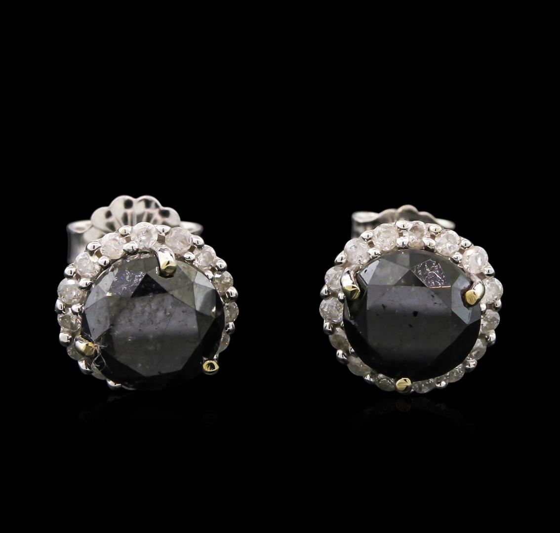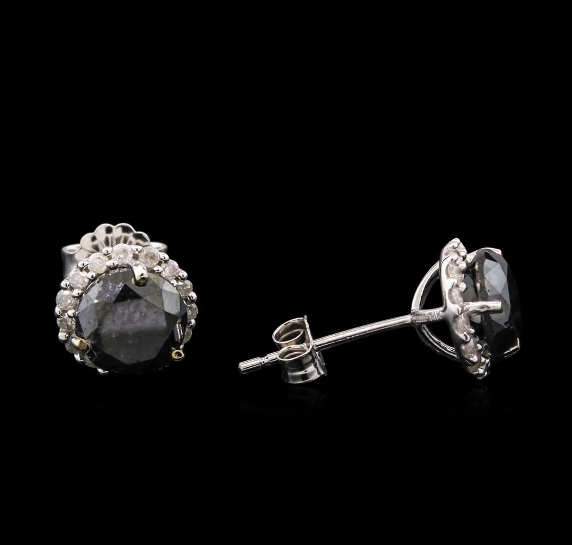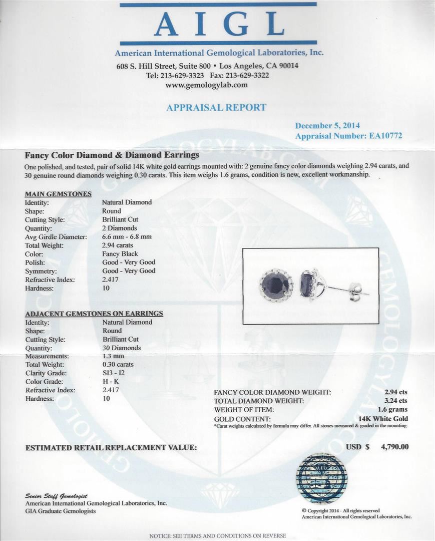One polished, and tested, pair of solid 14KT white gold earrings mounted with : 2 genuine fancy color diamonds weighing 2.94 carats, and 30 genuine round diamonds weighing 0.30 carats. This item weighs 1.6 grams, condition is new, excellent workmanship. Main Gemstones. Identity: Natural Diamond. Shape: Round. Cutting Style: Brilliant Cut. Quantity: 2 Diamonds. Avgas Girdle Diameter: 6.6 mm - 6.8 mm. Total Weight: 2.94 carats. Color: Fancy Black. Polish: Good - Very Good. Symmetry: Good - Very Good. Refractive Index: 2.417. Hardness: 10. Adjacent Gemstones On Earrings. Identity: Natural Diamond. Shape: Round. Cutting Style: Brilliant Cut. Quantity: 30 Diamonds. Measurements: 1.3 mm. Total Weight: 0.30 carats. Clarity Grade: SI3 - I2. Color Grade: H - K. Refractive Index: 2.417. Hardness: 10. Fancy Color Diamond Weight: 2.94cts. Total Diamond Weight: 3.24cts. Weight of Item: 1.6 grams/ Gold Content: 14K White Gold. AIGL Appraised at $4,790.00.