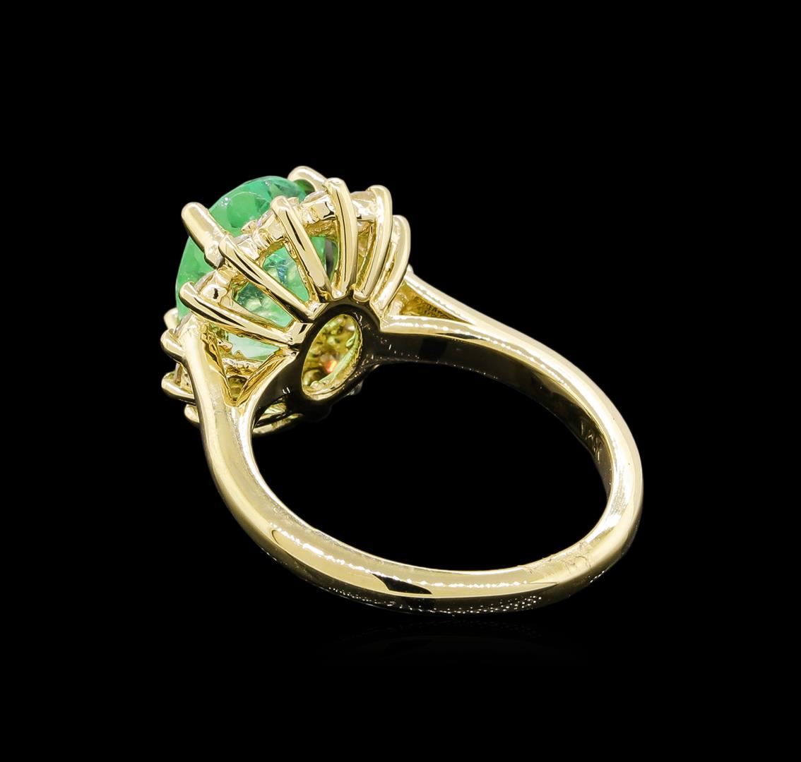 One electronically tested 14KT yellow gold lady's cast fashion ring with a basket halo with a bright polish finish. The featured lady's ring has a shank measuring 2.27 millimeters wide. Identified with markings of '14K'. Condition is new, good workmanship. Containing: One prong set oval modified brilliant cut natural emerald, measuring 10.32 x 7.59 x 7.12mm, (depth est.) approximate weight of 3.25ct., clarity is heavily included, medium light, moderately strong, green color, (GIA G 4/4), cut is good. Transmitting light somewhat diffusely, semi-transparent to translucent. Naturally occurring internal & external characteristics are present. Indications of oil residue. Colored gemstones are presumed to have been subjected to commonly used enhancement processes. Graded in the setting. Fourteen prong set round brilliant cut diamonds, measuring 2.40 - 2.30 x 1.46mm (depth est.) approximate total weight of 14 Stones = 0.70ct. Graded in the setting. Clarity SI-1 to SI-2. Color: H - I Cut Good. Total Weight of Colored Stones 3.25ct.. Total Weight of Diamonds 0.70ct.. Total Weight of Ring 5.80gm. GAS Appraised at $5,610.00.
