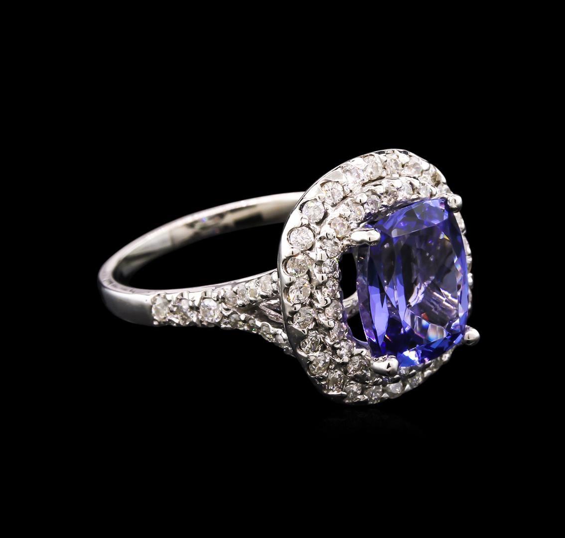 One electronically tested 14KT white gold lady's cast fashion ring with a double halo with a bright polish finish. The featured lady's ring has a shank measuring 1.80 millimeters wide. Identified with markings of "K14". Condition is new, good workmanship. Containing: One prong set rectangular cushion modified brilliant cut natural tanzanite, measuring 9.92 x 7.97 x 4.79mm, 9% bulge factor, approximate weight of 3.25ct., clarity is eye clean, type I, medium, very slightly grayish, bluish violet color, (GIA bV 5/3), cut is good. Transmitting light with no distortion, transparent. Colored gemstones are presumed to have been subjected to commonly used enhancement processes. Graded in the setting. Thirty-Four prong set round brilliant cut diamonds, measuring 1.40 - 1.30 x 0.81mm (depth est.) approximate total weight of 34 Stones = 0.31ct. Graded in the setting. Clarity: SI-2 to I-1. Color: H - I. Cut Good. Thirty-Two prong set round brilliant cut diamonds, measuring 1.60 - 1.50 x 0.93mm (depth est.) approximate total weight of 32 Stones = 0.44ct. Graded in the setting. Clarity: SI-2 to I-1. Color: H - I. Cut Good. Total Weight of Colored Stones 3.25ct. Total Weight of Diamonds 0.75ct. Total Weight of Ring 5.10gm. GAS Appraised at $7,290.00.