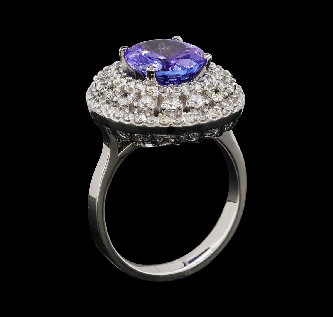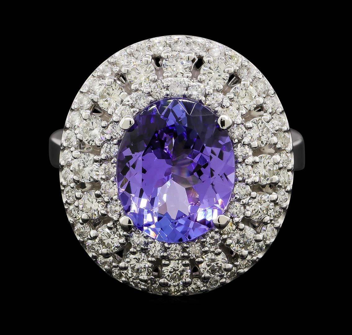 One electronically tested 14KT white gold lady's cast fashion ring with a triple basket halo with a bright polish finish. The featured lady's ring has a shank measuring 3.12 millimeters wide. Identified with markings of 'K14'. Condition is new, good workmanship. Containing: One prong set oval modified brilliant cut natural tanzanite, measuring 10.94 x 8.97 x 5.05mm, (depth est.) approximate weight of 3.35ct., clarity is eye clean, medium, moderately strong, bluish violet color, (GIA bV 5/4), cut is very good. Transmitting light with no distortion, transparent. Colored gemstones are presumed to have been subjected to commonly used enhancement processes. Graded in the setting. Sixteen prong set round brilliant cut diamonds, measuring 2.20 - 2.15 x 1.35mm (depth est.) approximate total weight of 16 Stones = 0.62ct. Graded in the setting. Clarity SI-1 to I-1. Color: G - H Cut Good Sixty-Two prong set round brilliant cut diamonds, measuring 1.40 - 1.30 x 0.84mm (depth est.) approximate total weight of 62 Stones = 0.58ct. Graded in the setting. Clarity SI-1 to I-1. Color: G - H Cut Good. Total Weight of Colored Stones 3.35ct.. Total Weight of Diamonds 1.20ct.. Total Weight of Ring 8.20gm. GAS Appraised at $9,620.00.
