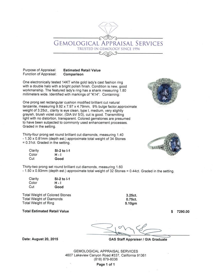 One electronically tested 14KT white gold lady's cast fashion ring with a double halo with a bright polish finish. The featured lady's ring has a shank measuring 1.80 millimeters wide. Identified with markings of "K14". Condition is new, good workmanship. Containing: One prong set rectangular cushion modified brilliant cut natural tanzanite, measuring 9.92 x 7.97 x 4.79mm, 9% bulge factor, approximate weight of 3.25ct., clarity is eye clean, type I, medium, very slightly grayish, bluish violet color, (GIA bV 5/3), cut is good. Transmitting light with no distortion, transparent. Colored gemstones are presumed to have been subjected to commonly used enhancement processes. Graded in the setting. Thirty-Four prong set round brilliant cut diamonds, measuring 1.40 - 1.30 x 0.81mm (depth est.) approximate total weight of 34 Stones = 0.31ct. Graded in the setting. Clarity: SI-2 to I-1. Color: H - I. Cut Good. Thirty-Two prong set round brilliant cut diamonds, measuring 1.60 - 1.50 x 0.93mm (depth est.) approximate total weight of 32 Stones = 0.44ct. Graded in the setting. Clarity: SI-2 to I-1. Color: H - I. Cut Good. Total Weight of Colored Stones 3.25ct. Total Weight of Diamonds 0.75ct. Total Weight of Ring 5.10gm. GAS Appraised at $7,290.00.